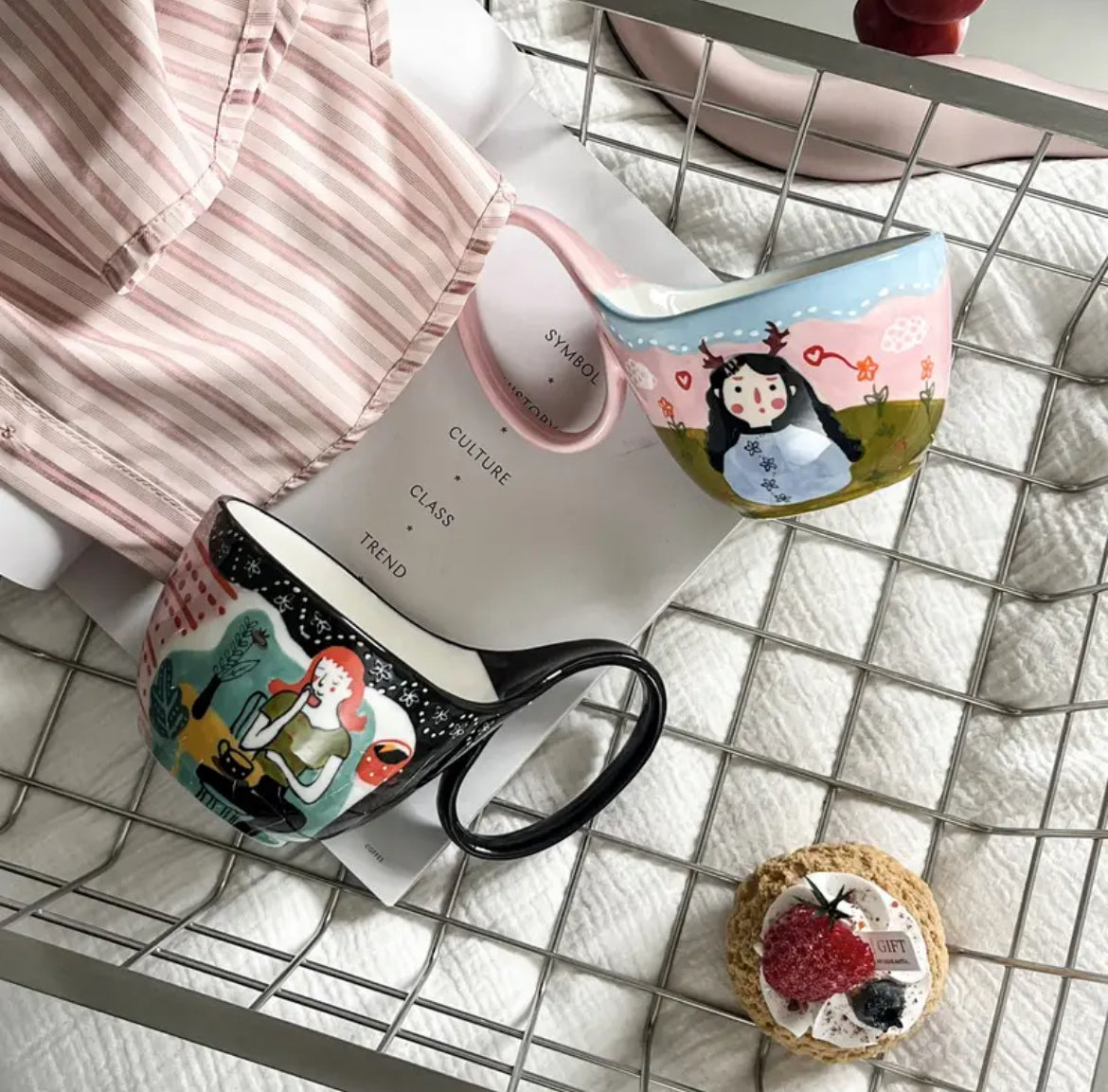 Our ceramic mugs aren't just functional; they're also an expression of style. The unique girl painting adds an artistic touch. making them a standout piece in any kitchen. Use them to showcase your love for aesthetic designs or as custom decor items in your home.