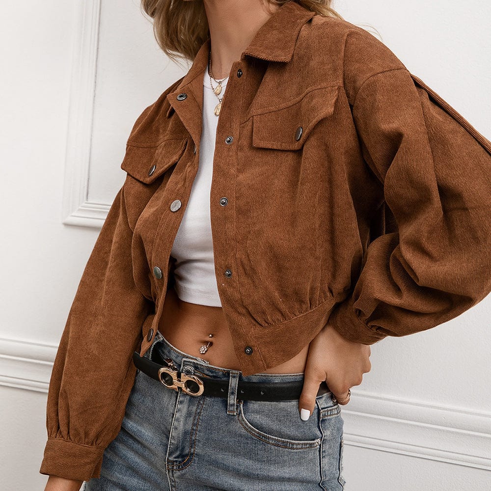 Stay comfortable and stylish with the Addison Corduroy Crop Jacket. This versatile jacket is made of a soft and durable corduroy fabric and features a regular fit with a single-breasted closure. classic solid pattern. and two pockets. Perfect for any season. this jacket is a great addition to your wardrobe.