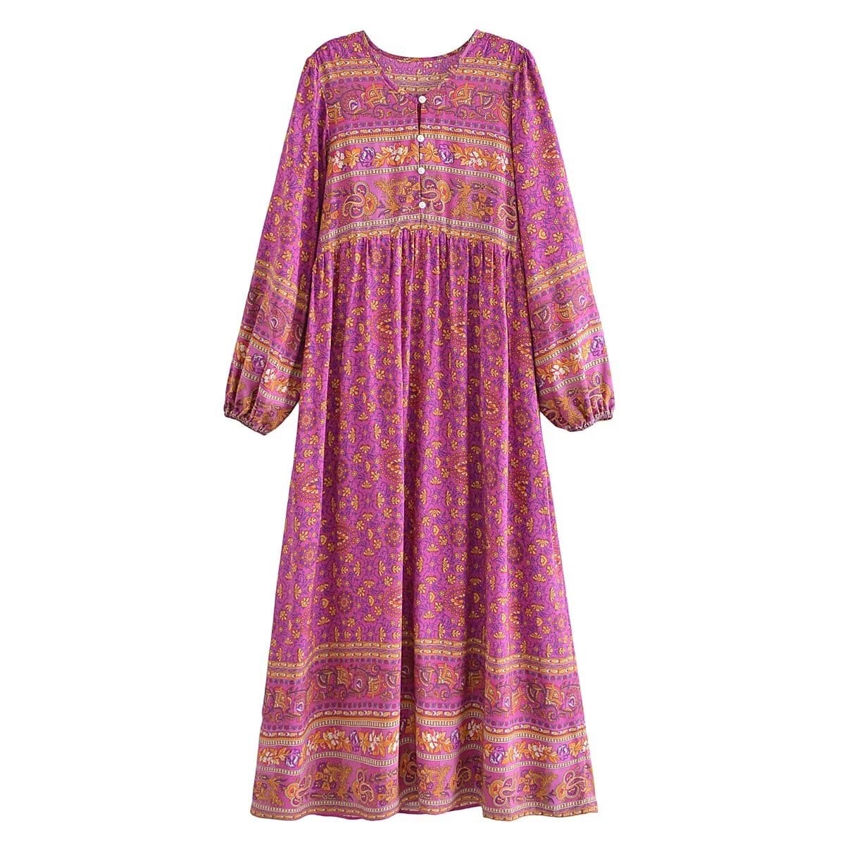The perfect go-to for any day or night. our Alice Long Sleeve Boho Maxi Dress will keep you looking stylish and comfortable. This dress is made of a soft fabric that is designed to be flattering and is perfect for any body type. It features V-neckline. long sleeves. and a high waistline.