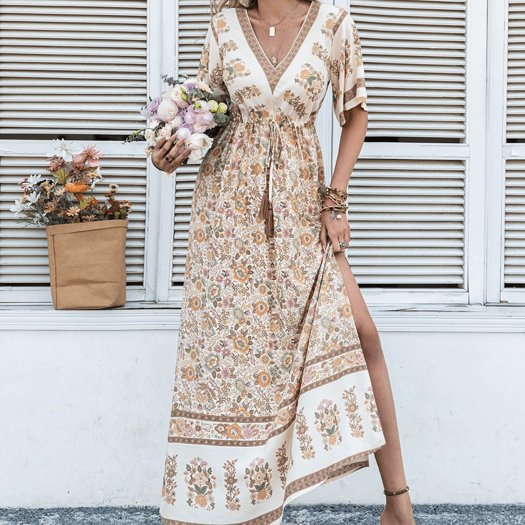 Get ready to turn heads at your next vacay with the Amelia Boho Maxi Dress! With it's fresh floral vibe. playful ruffles. and fluttery butterfly sleeves. this oh-so-sweet maxi dress will make you look and feel like a million bucks. Plus. the classic fit. tie. and fringe just add to the feel-good vibes. Make a statement. feel good!