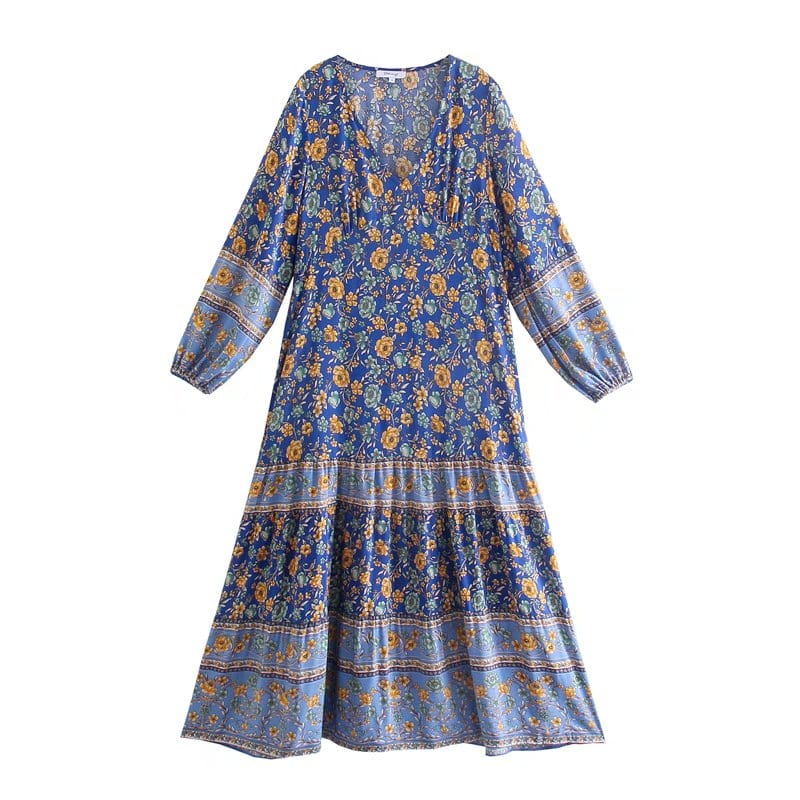 About: This gorgeously printed maxi dress has a drapey. tiered style with a V-neckline and exaggerated sleeves for additional shape. making it ideal for any event.