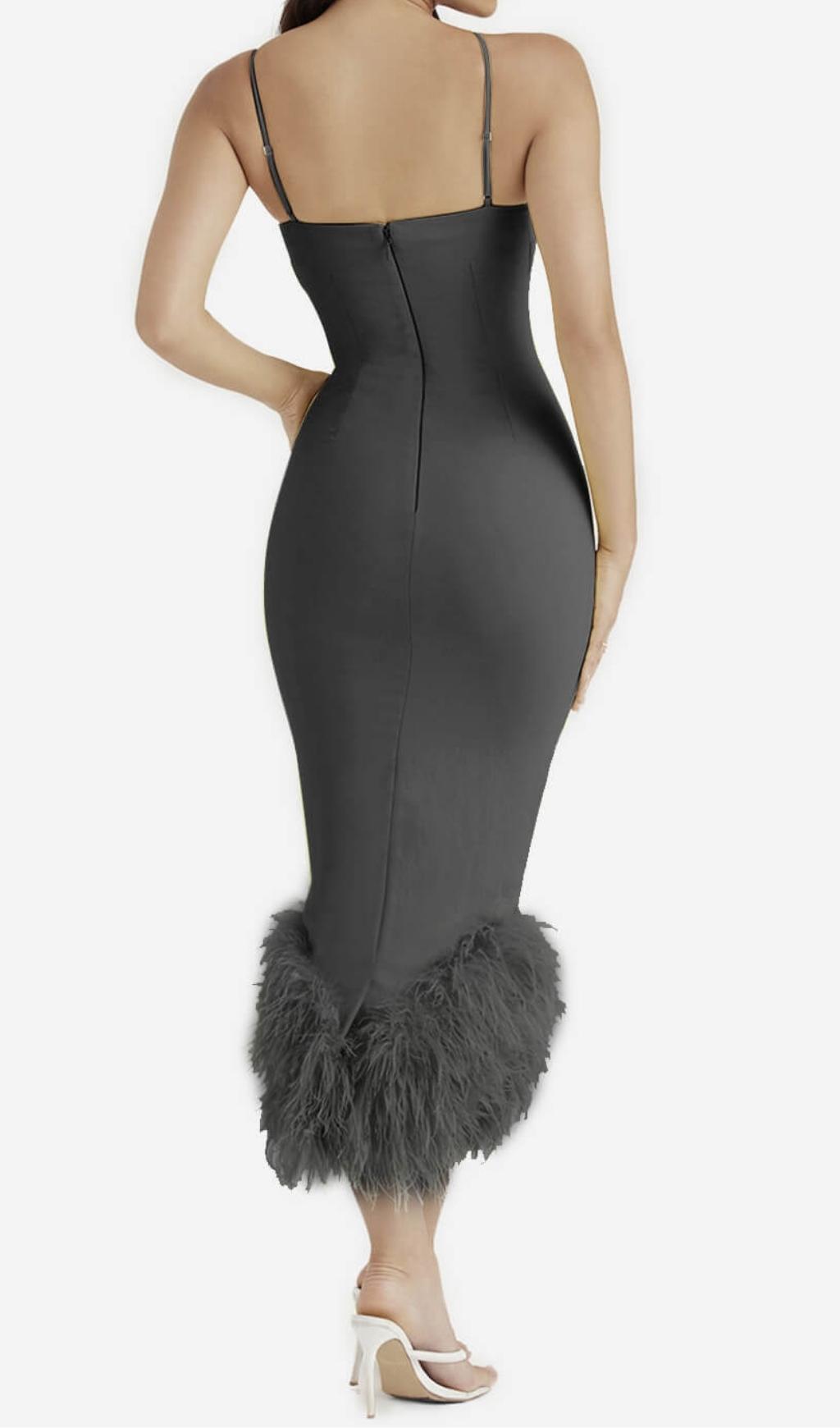 This Bandage Backless Maxi Dress in Verde is the perfect dress for summer. exuding a romantic vacation vibe. Its beautifully designed cross-over shoulder design adds an elegant touch. while the tight fit showcases your curves and charm. The dress is completed with feathers at the end. providing a stunning finishing touch.