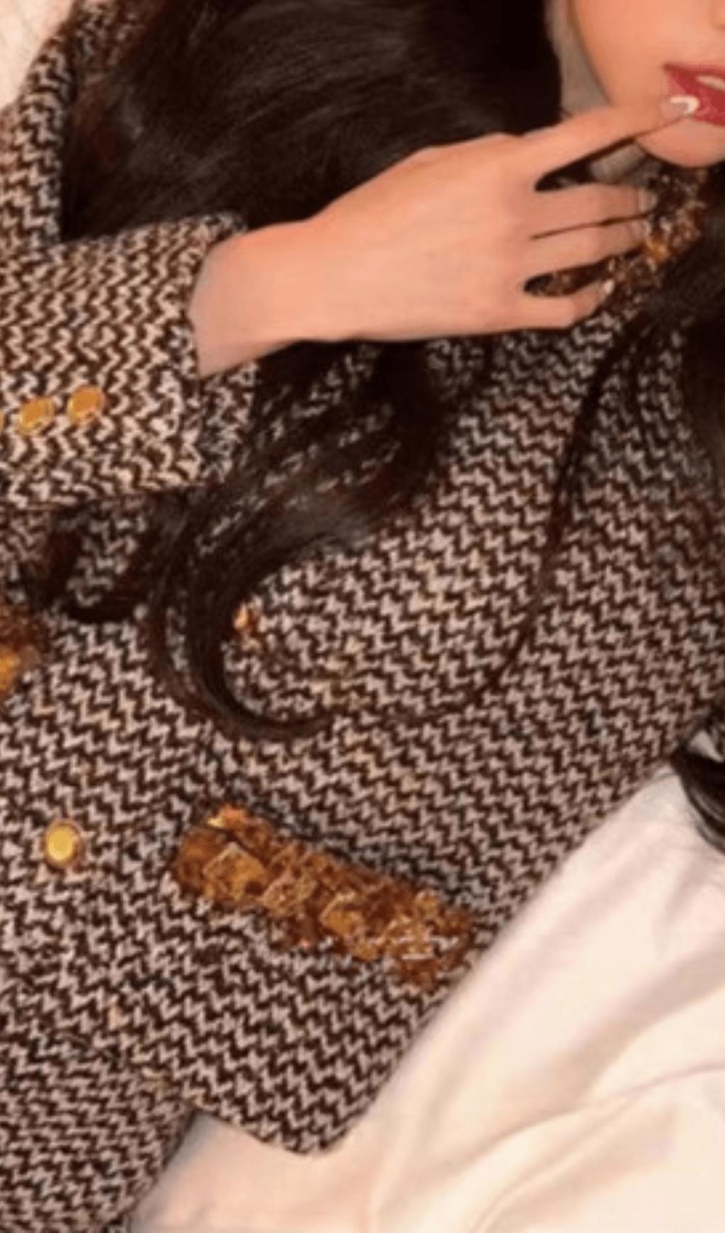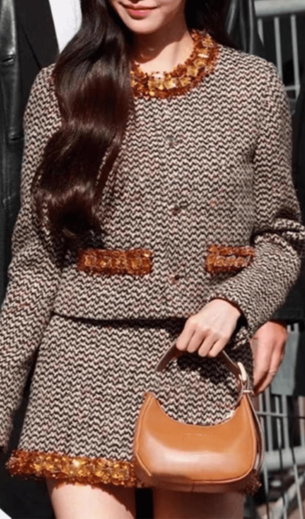 Elevate your style with our suit. The intricate bead embellishments add a touch of whimsy to this classic tweed coat suit. making it perfect for any special occasion. Stay stylish and playful with this unique and fun addition to your wardrobe.