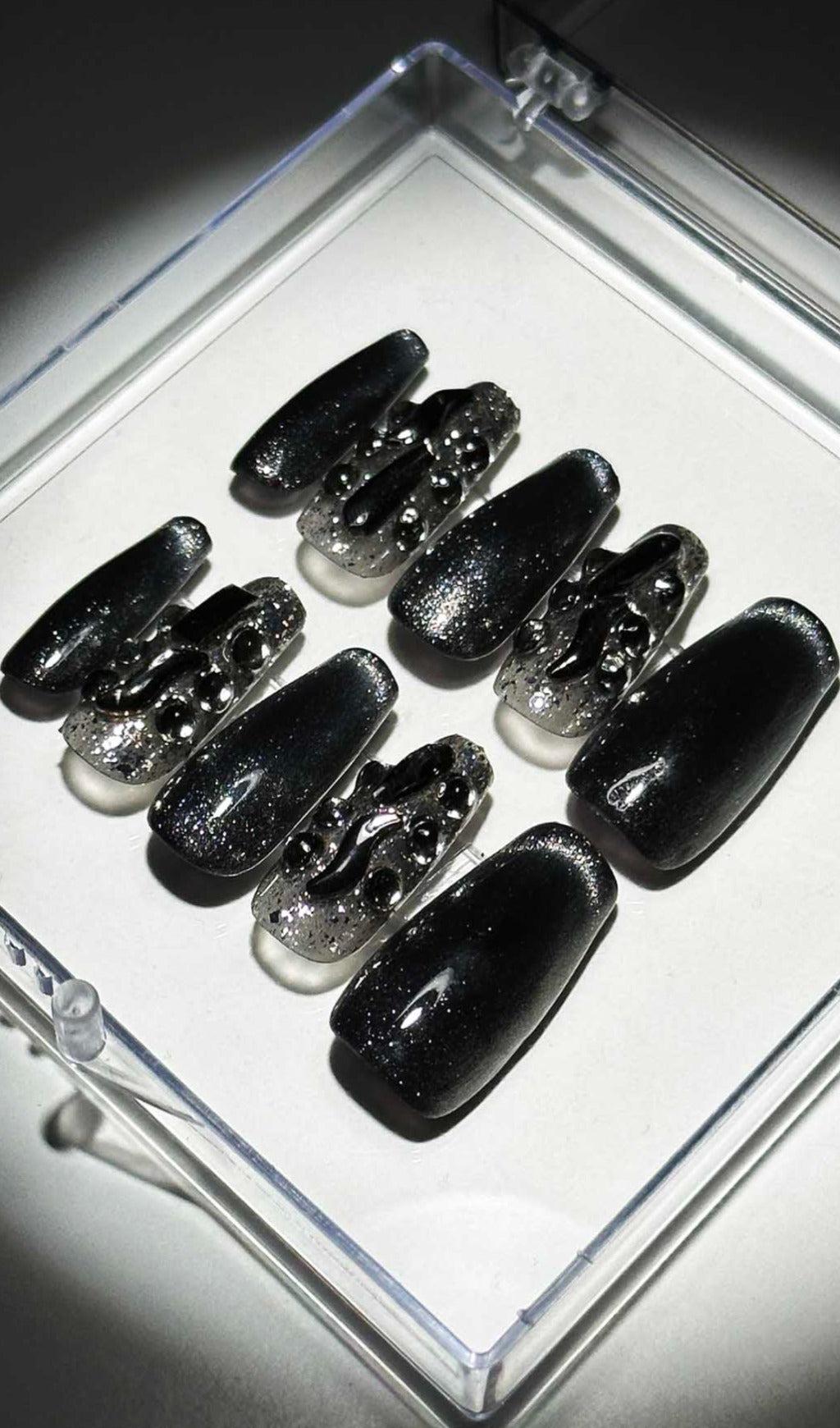 Add a touch of elegance and sophistication to your nails with our handmade Black Cat Eye Crystal Press On Nails. These stunning nails are meticulously crafted with black Cat Eye crystal accents. creating a mesmerizing look that will turn heads wherever you go.