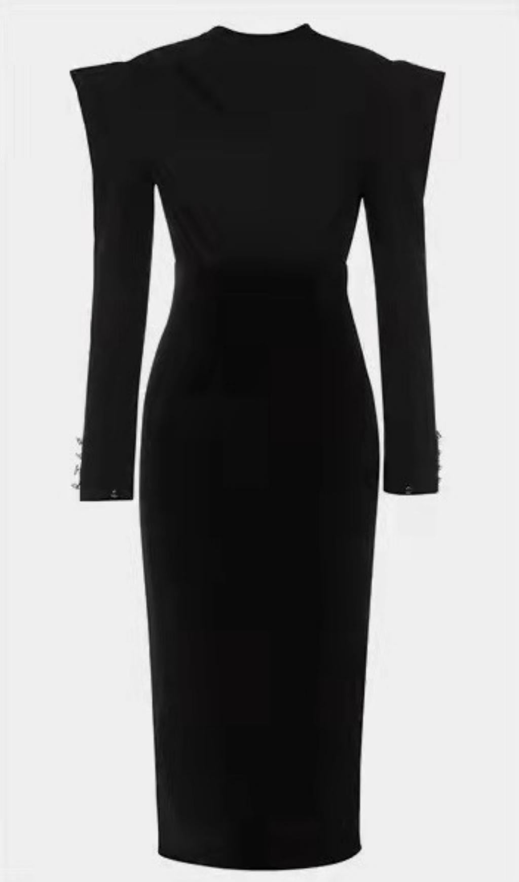 The Black Mid-Neck Padded Shoulder Waist Tie Dress is a stunning and versatile piece that will elevate your wardrobe. This dress features a mid-neck design with padded shoulders for a structured and stylish look. The waist tie detail adds a flattering touch. allowing you to cinch in the waist for a customized fit.