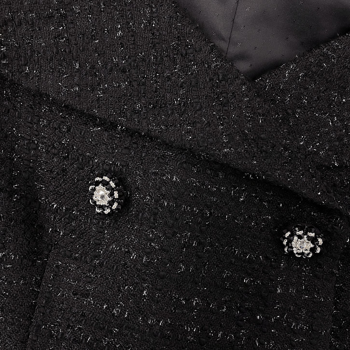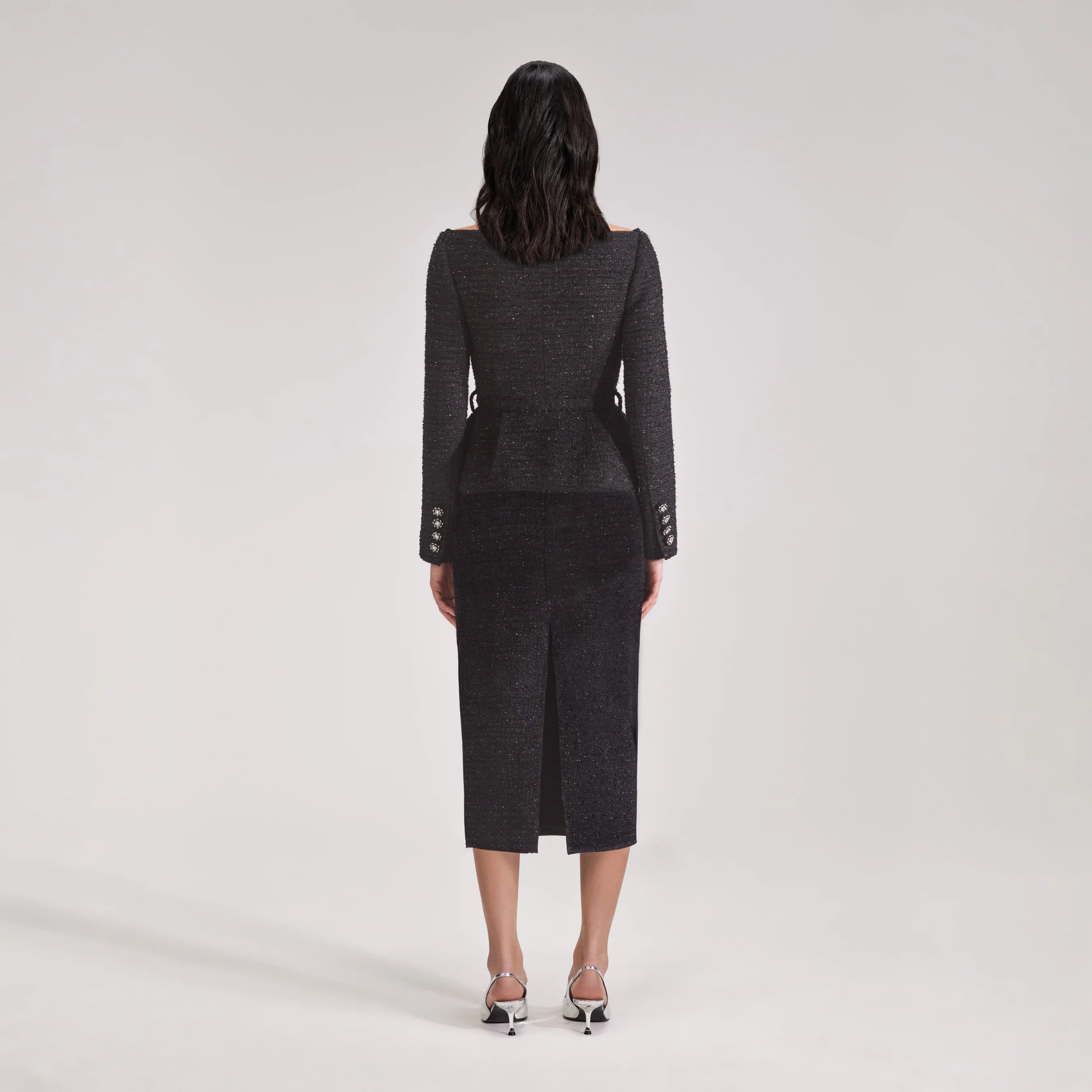 This stunning dress features a flattering off-shoulder design and a unique boucle fabric that adds texture and dimension to your look. Stay chic and comfortable in this must-have dress!"