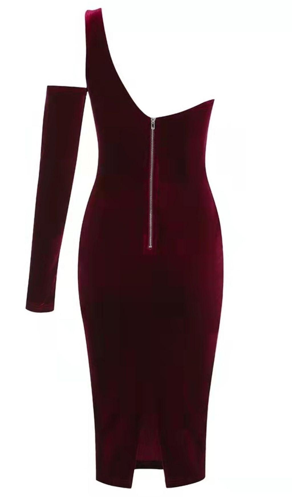 BLACK ONE SHOULDER VELVET MIDI DRESS