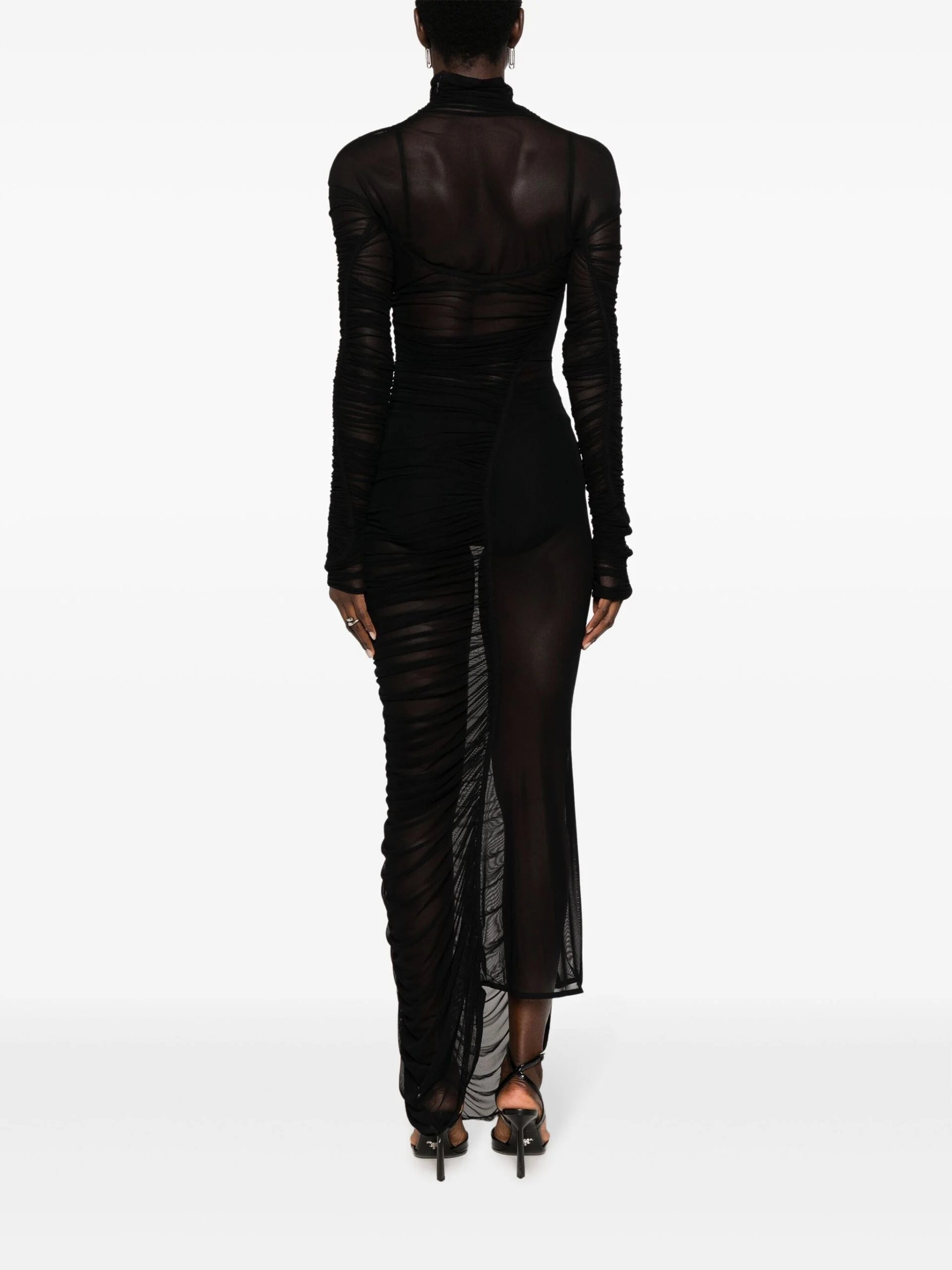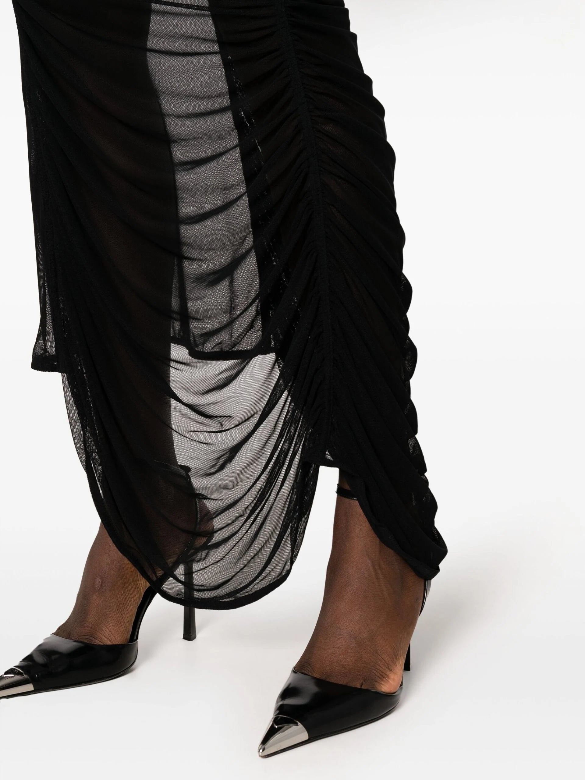 The ruched detailing adds a touch of playfulness to the flowy sheer fabric. making you the star of any event. Don't be afraid to show off your bold and unique style with this dress!"