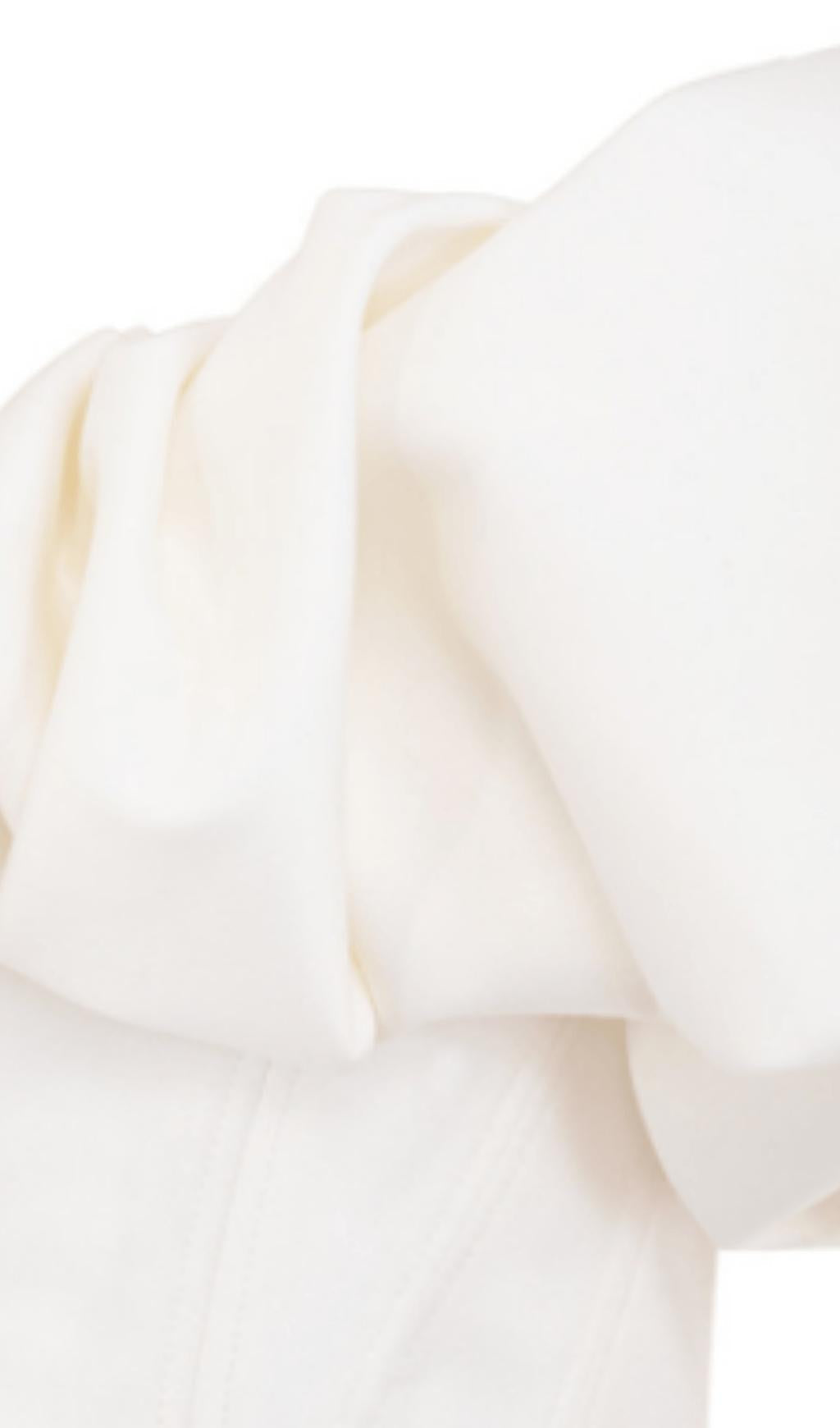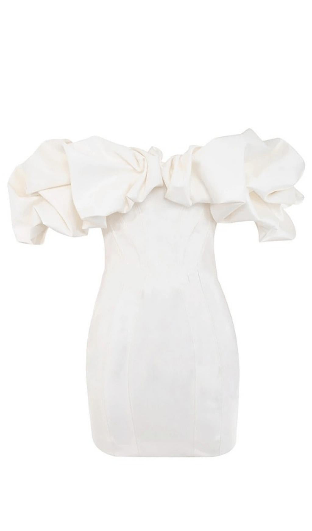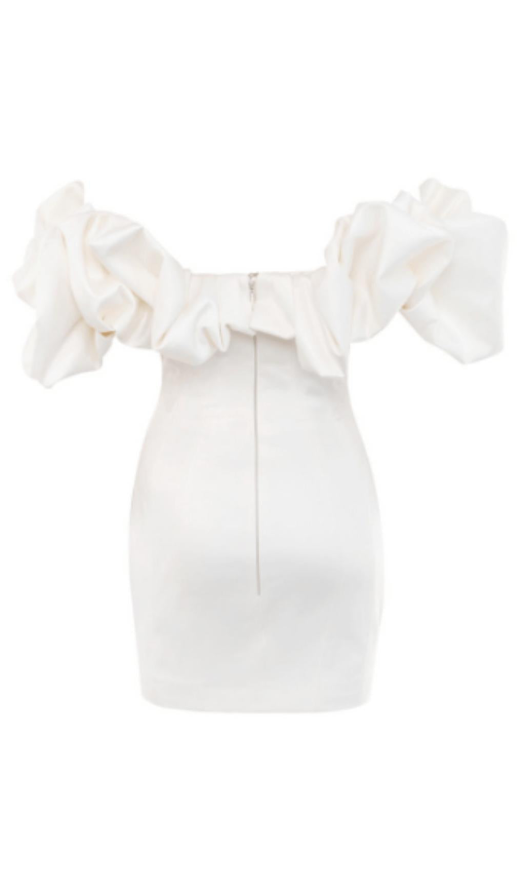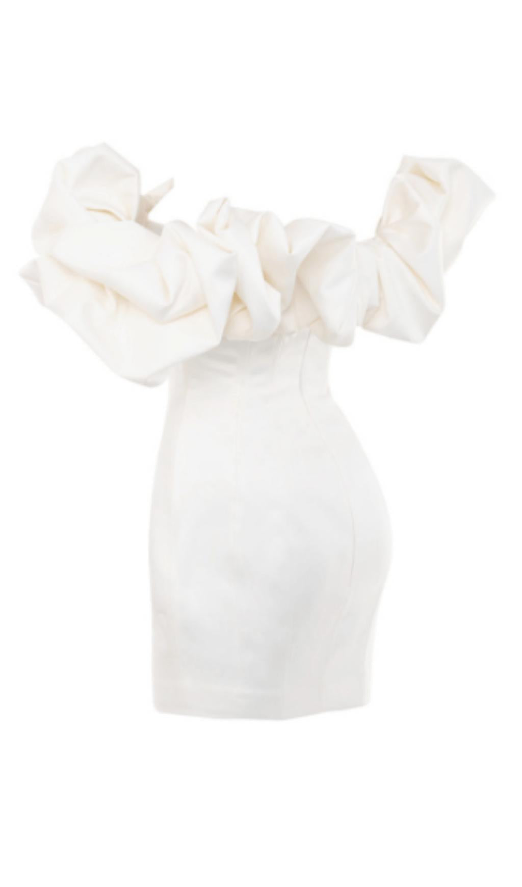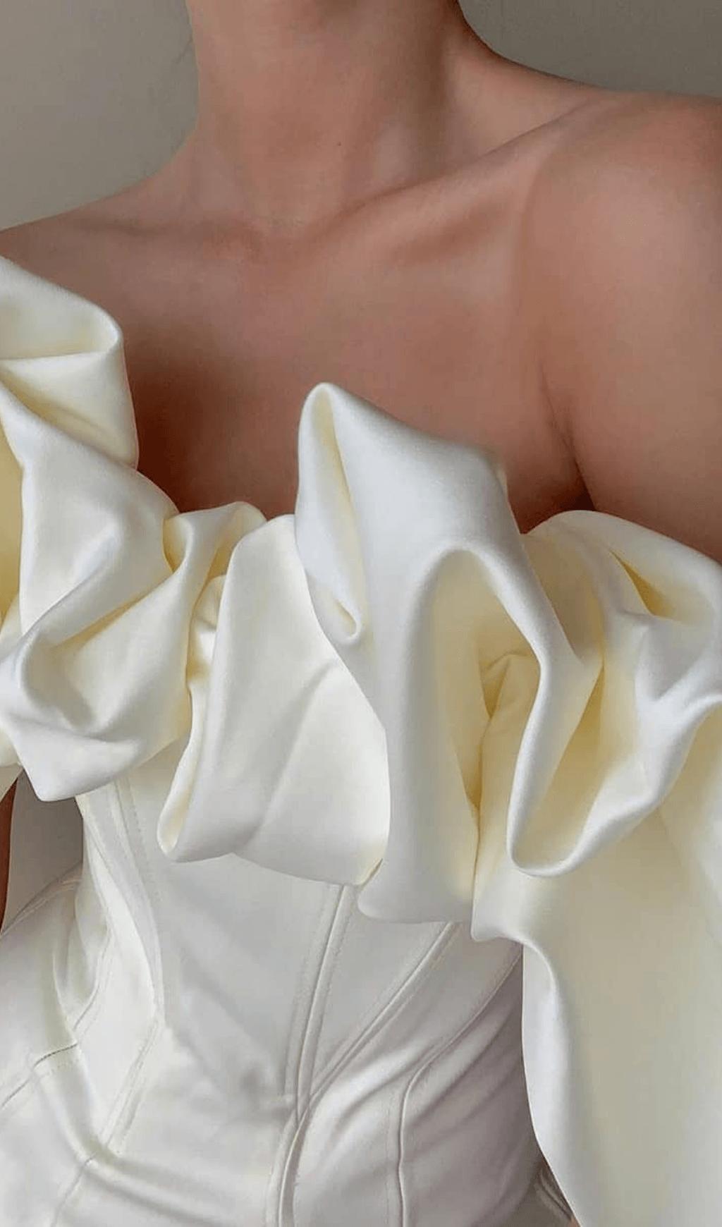 Get ready to turn heads in this stunning strapless dress. Made from a lustrous heavyweight duchess satin. this dress is designed to create the perfect hourglass shape. The clever paneling and oversized ruffles on the shoulders add a touch of drama. while the off-shoulder cut exudes sexiness. Whether you're attending a cocktail party or a special event. this dress is sure to make a statement.