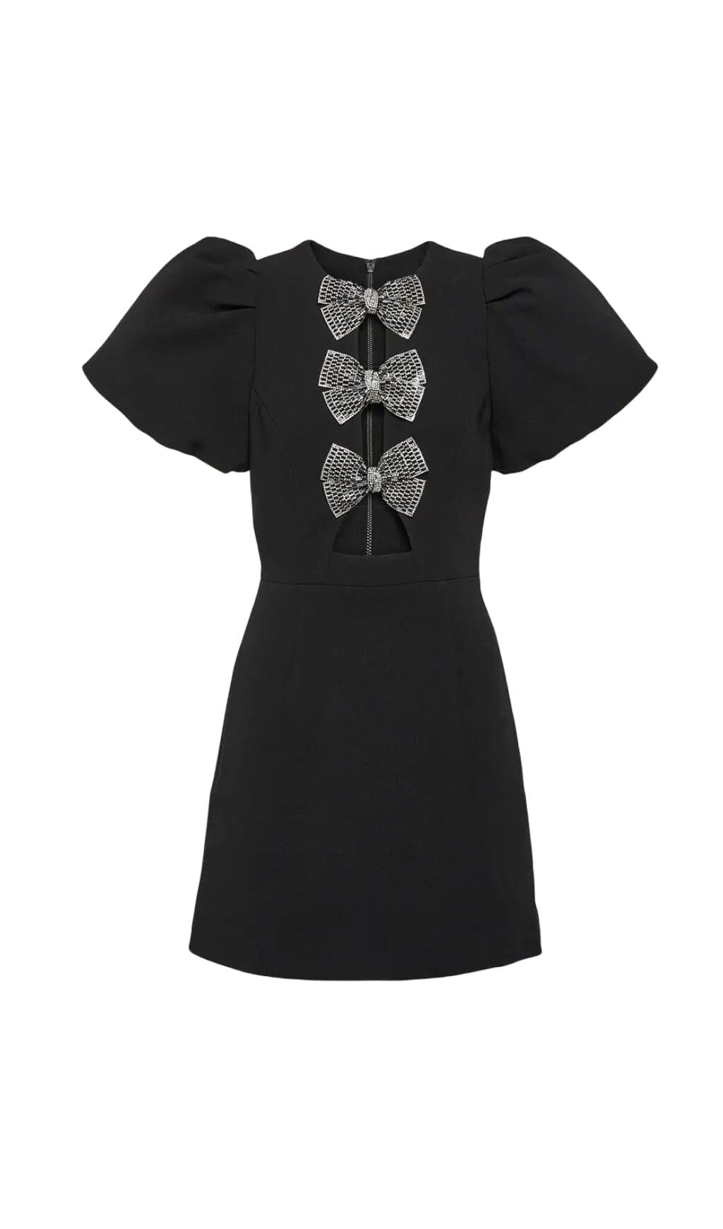 Be cute'n'comfy in this flirty little black mini dress with short sleeves. round neckline. and bow detailing. Its hollowed out design will make sure you look sweet and sassy every time!