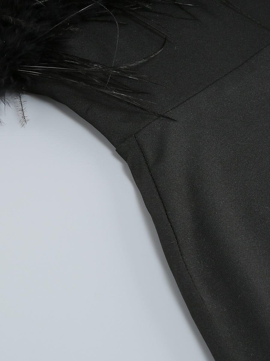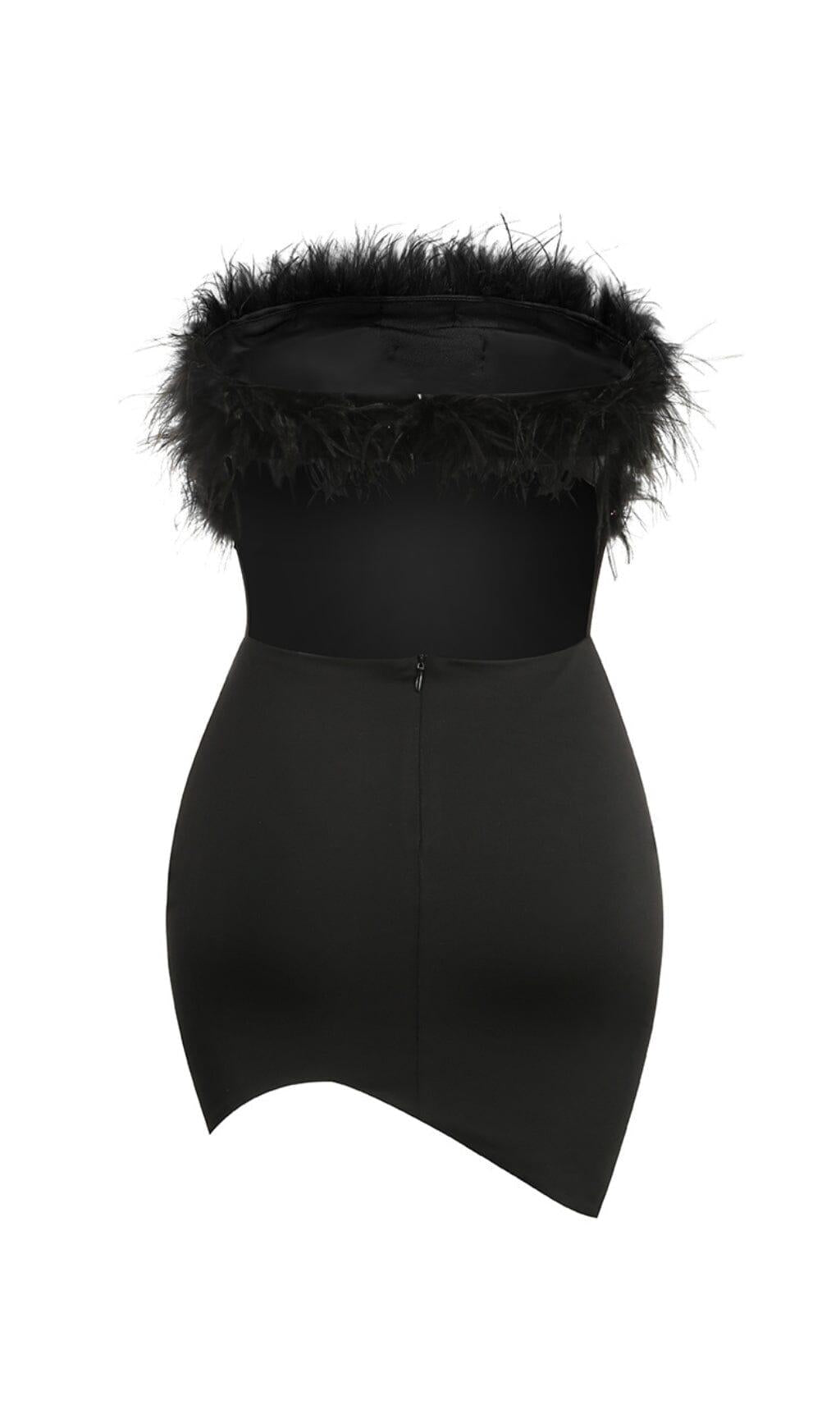 Complete the look by pairing this dress with your favorite heels and accessories. Whether you're attending a formal event or hitting the dance floor. you'll feel confident and glamorous in this Black Strapless Feather Bodycon Mini Dress.