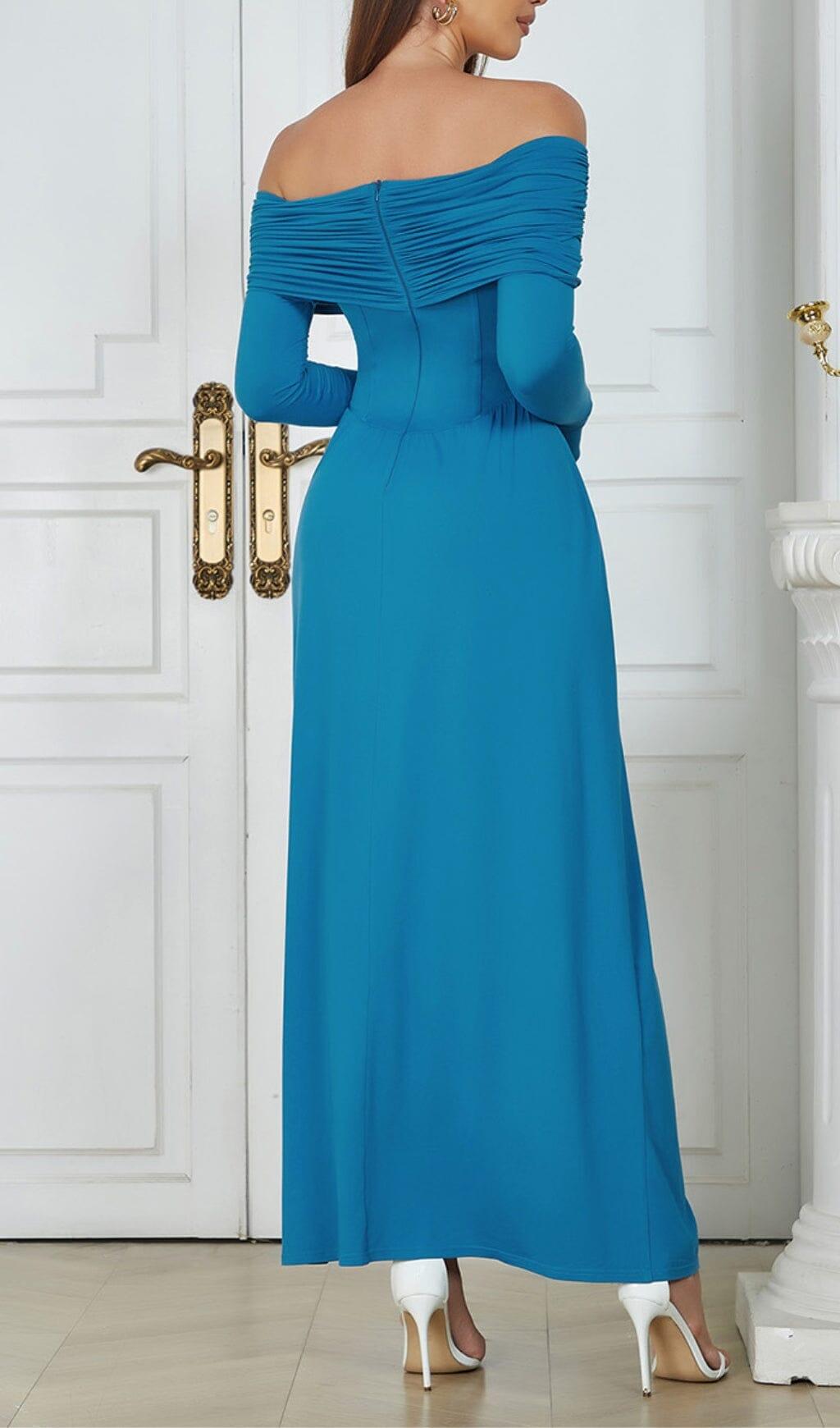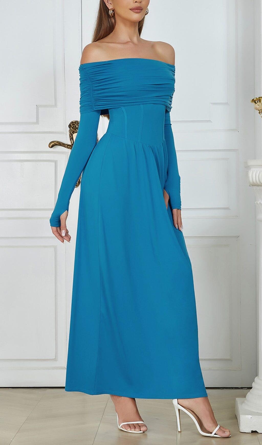 Walk into any room with confidence in this striking BLUE STRAPLESS LONG SLEEVE MAXI DRESS. Its timeless style and luxurious fabric offer a sophisticated look that turn heads. Its intricate stitching and figure-flattering silhouette will ensure you look your best for any occasion.