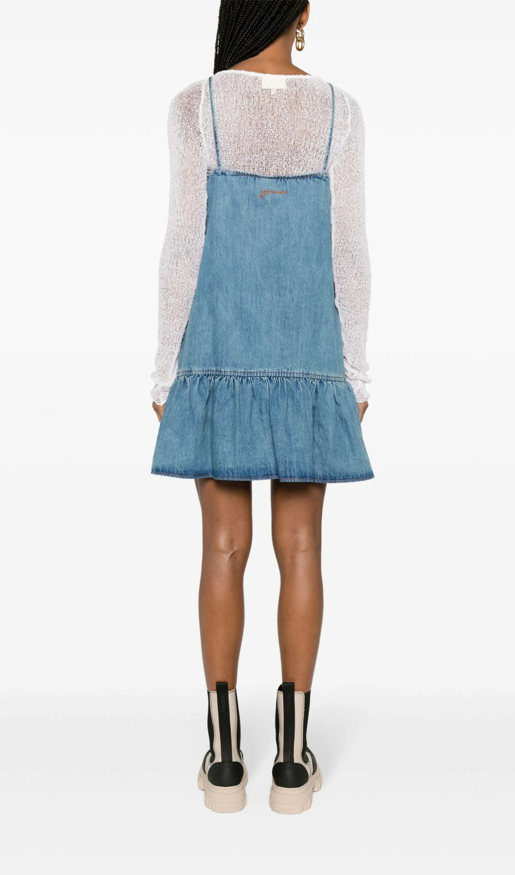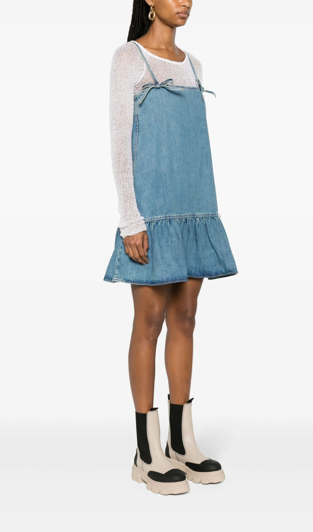 Made with a beautiful blue tint denim fabric. this dress is perfect for any occasion. Its mini length adds a touch of playfulness. while the overall design exudes effortless style. Get ready to turn heads with this dress that will surely be your new wardrobe favorite!"