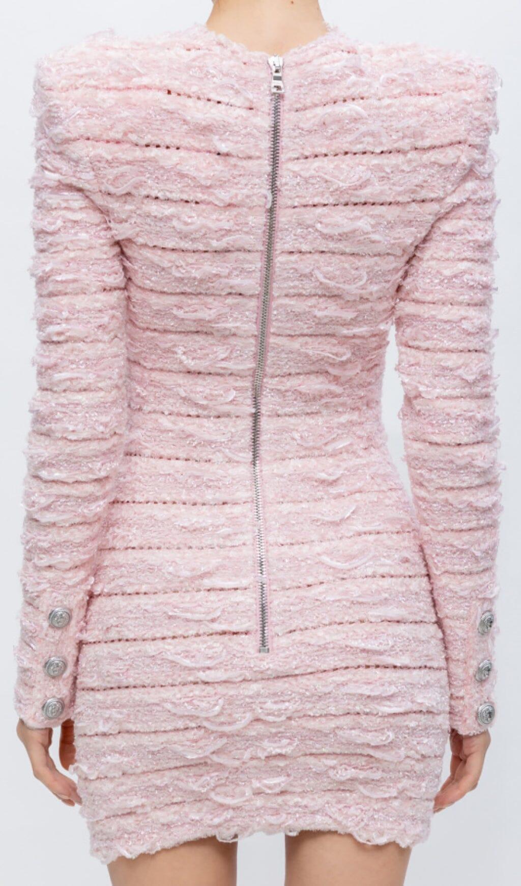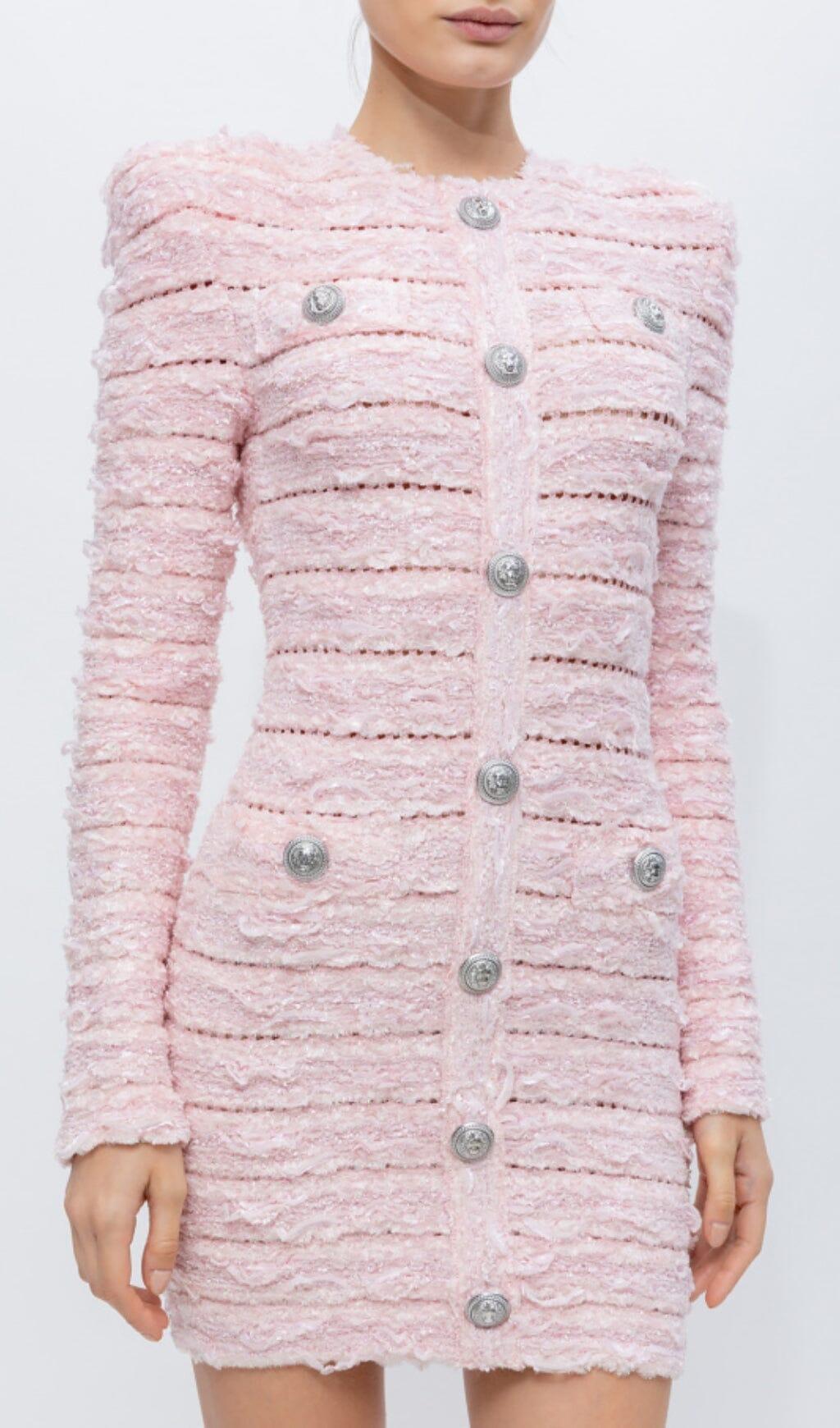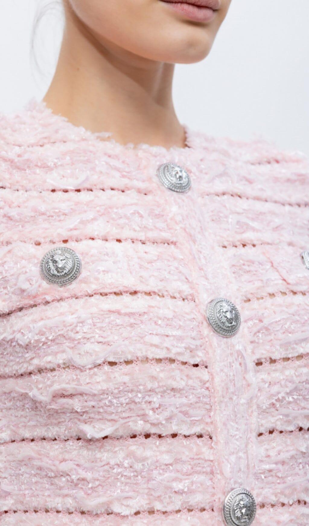It's made from a tactile bouclé knit with structured shoulders and comes dotted with embossed buttons at the front. some of which are decorative.