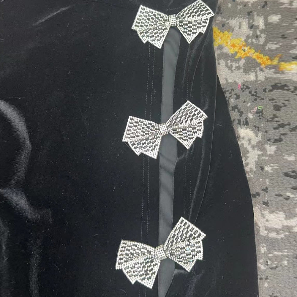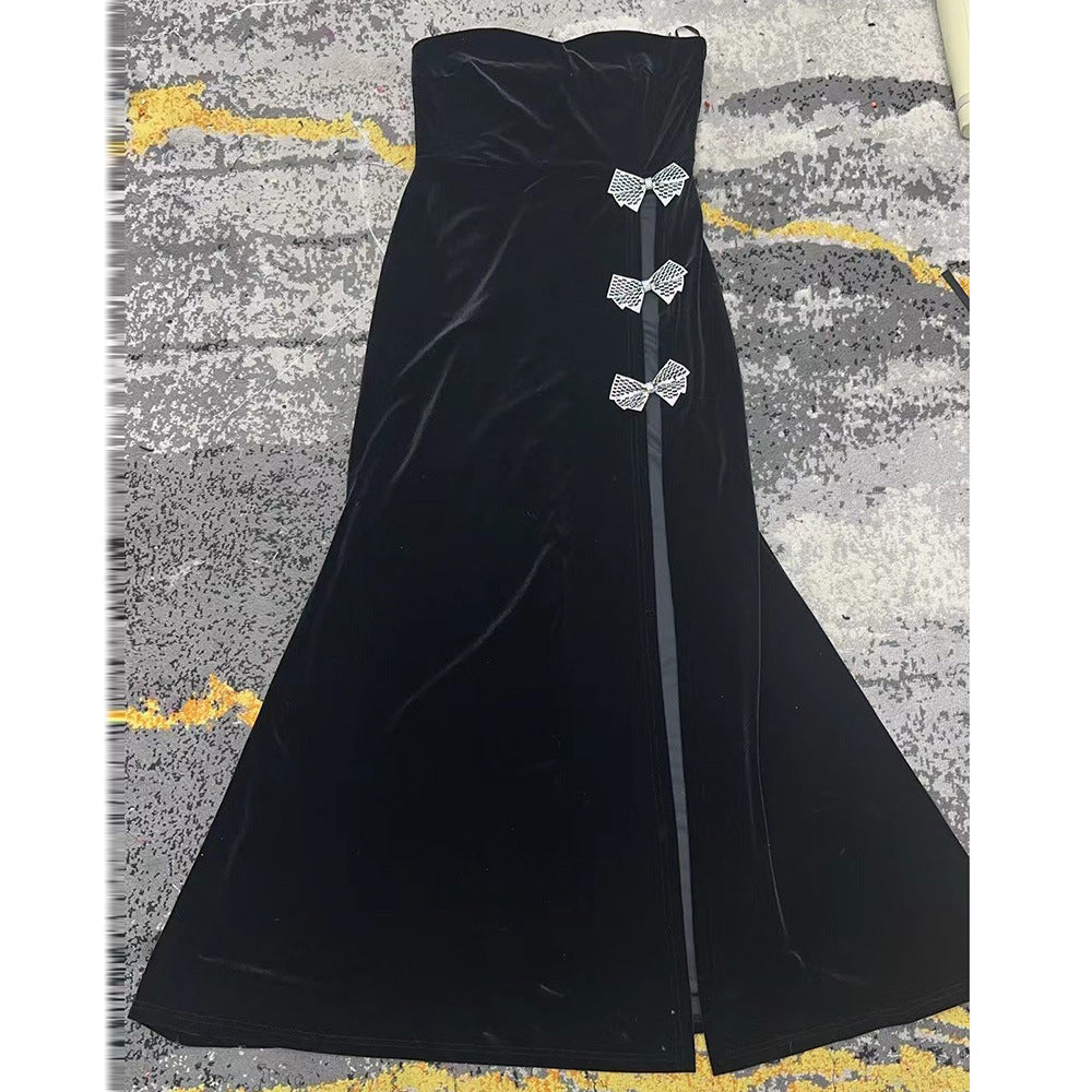The luxurious velvet material and high split design will make you stand out in a crowd. while the strapless neckline and bow detail add a touch of femininity. Look and feel your best with this must-have dress.