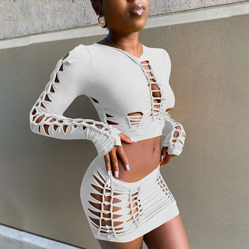 Redcit - Hollow Out Long Sleeve Slim 2 Piece Skirt Set