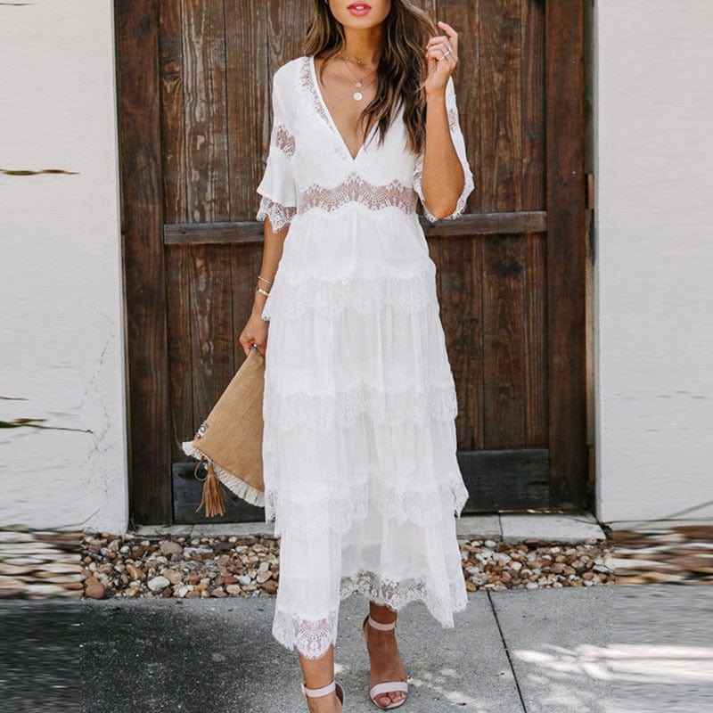 If this isn't luxe boho I don't know what is! Our beautiful Clarice Boho Maxi Dress features a deep v neckline. finished with a lace hem and lace sleeves. A perfect boho maxi for the season.