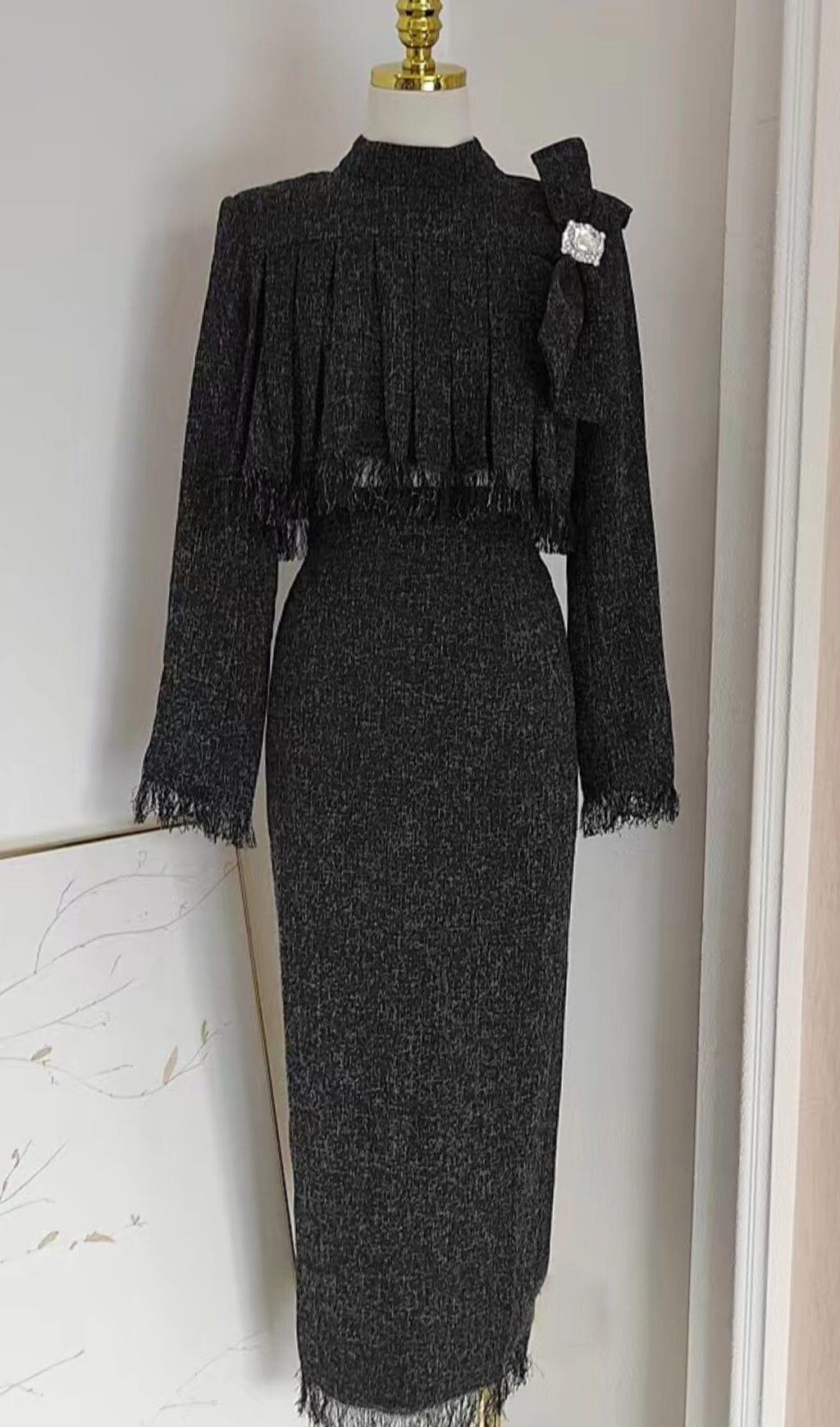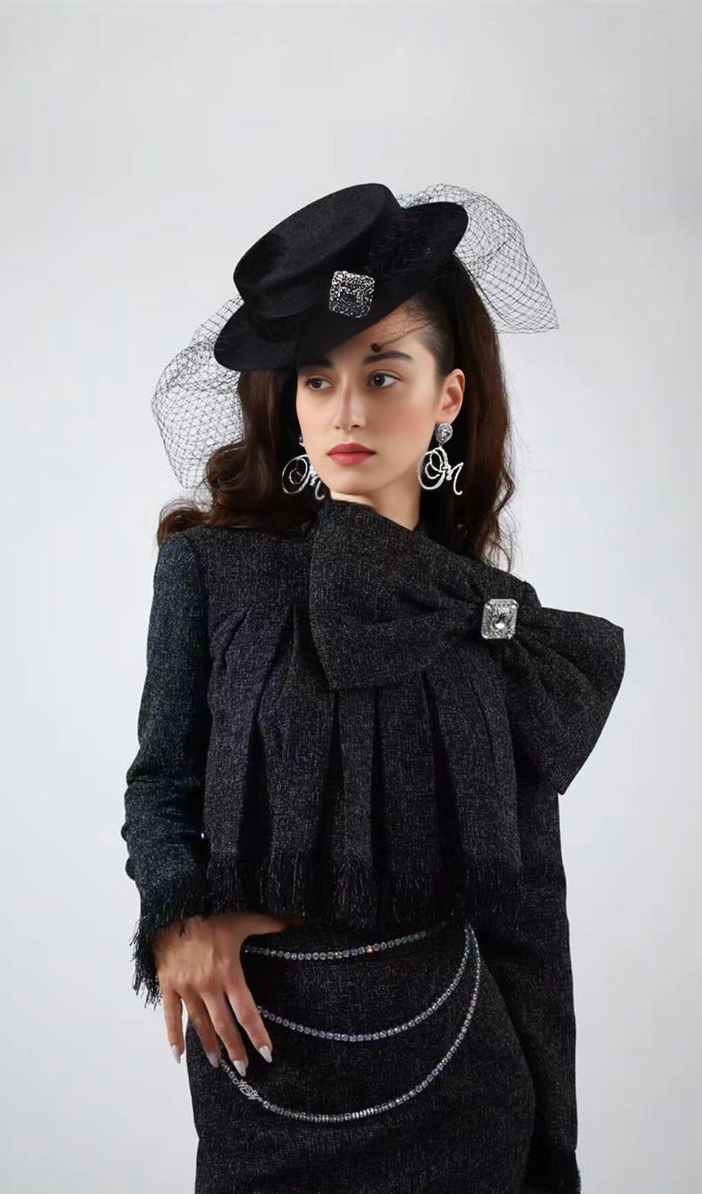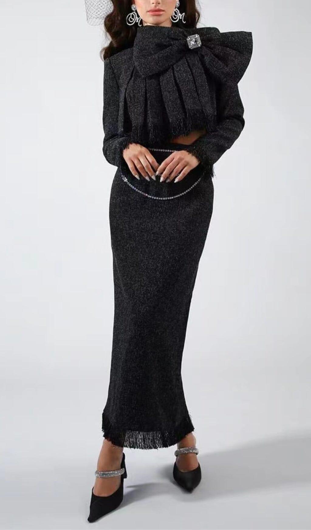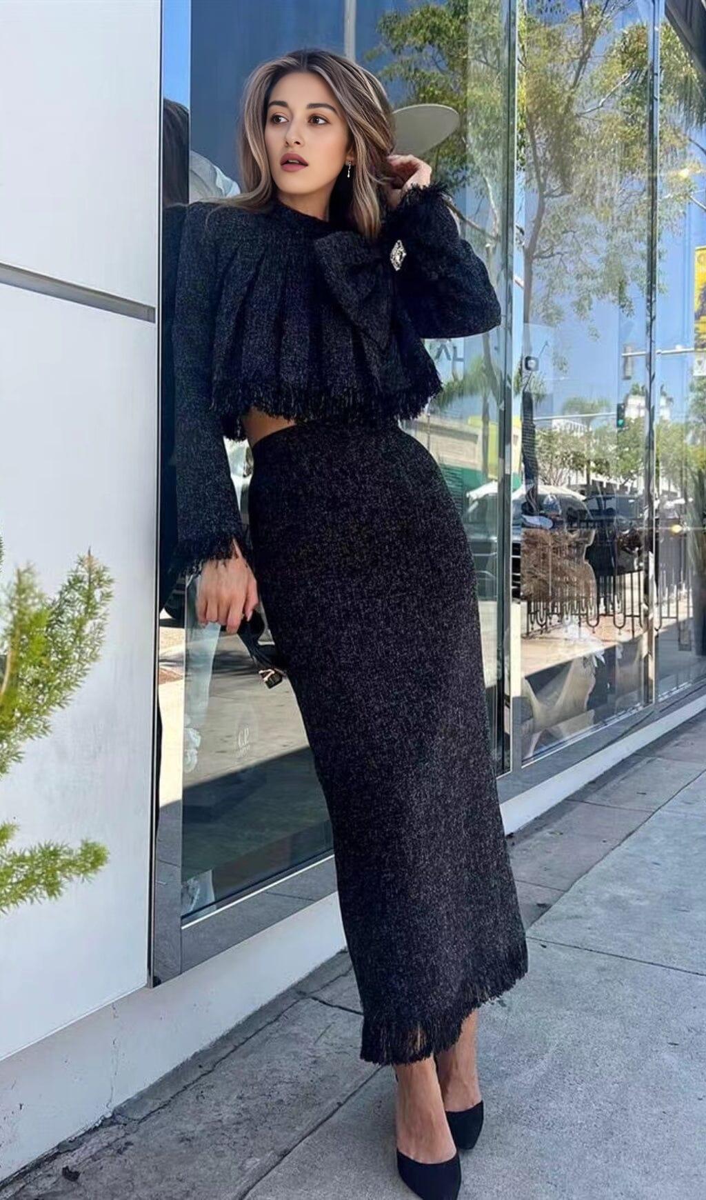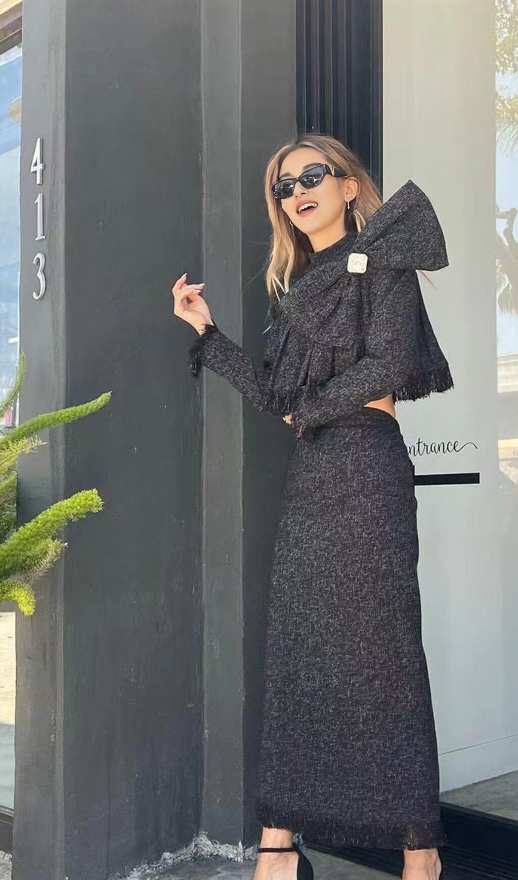 Experience timeless luxury with the black tweed bow embellished set. Crafted from exquisite. soft fabric. this elegant set is designed with a high neckline top and oversized bow detail for added sophistication. The coordinating pencil skirt features a fringed hem for a modern finish. Perfect for any special occasion. this exquisite set is sure to make a statement.