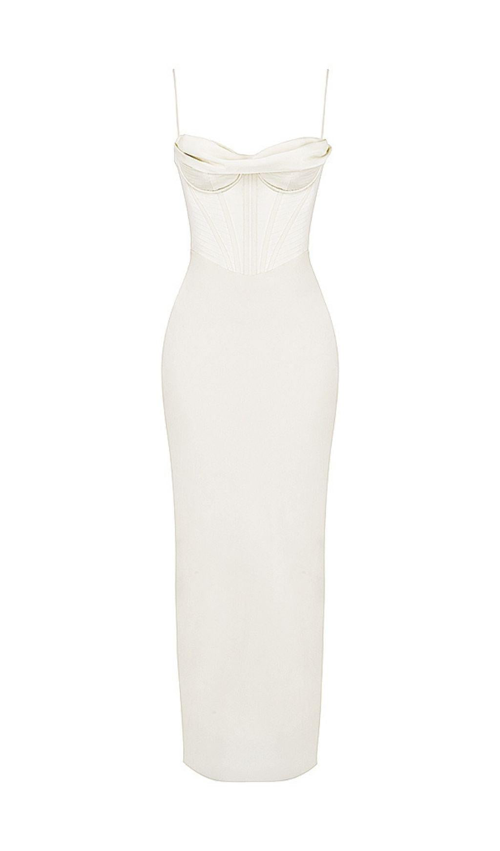 This maxi dress is the epitome of elegance and class. Made from lustrous silk satin in delicate ivory. it is cut on the bias to gently skim your figure. The beautifully draped cowl neckline adds a touch of sophistication. while the bodice features incredible corsetry boning to cinch the figure in.