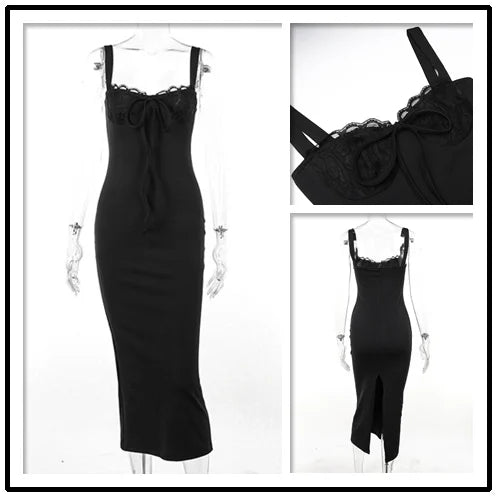 Lace Side Spaghetti Strap Summer Elegant Long Nightclub Midi Dress