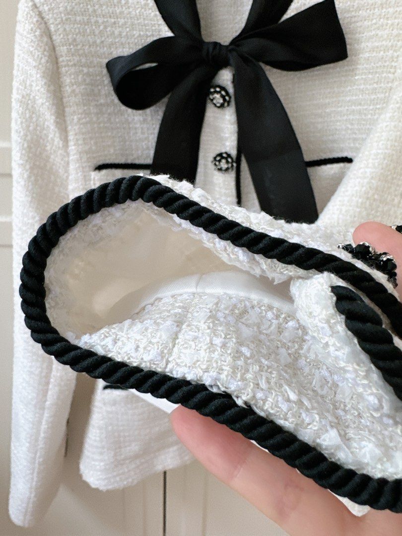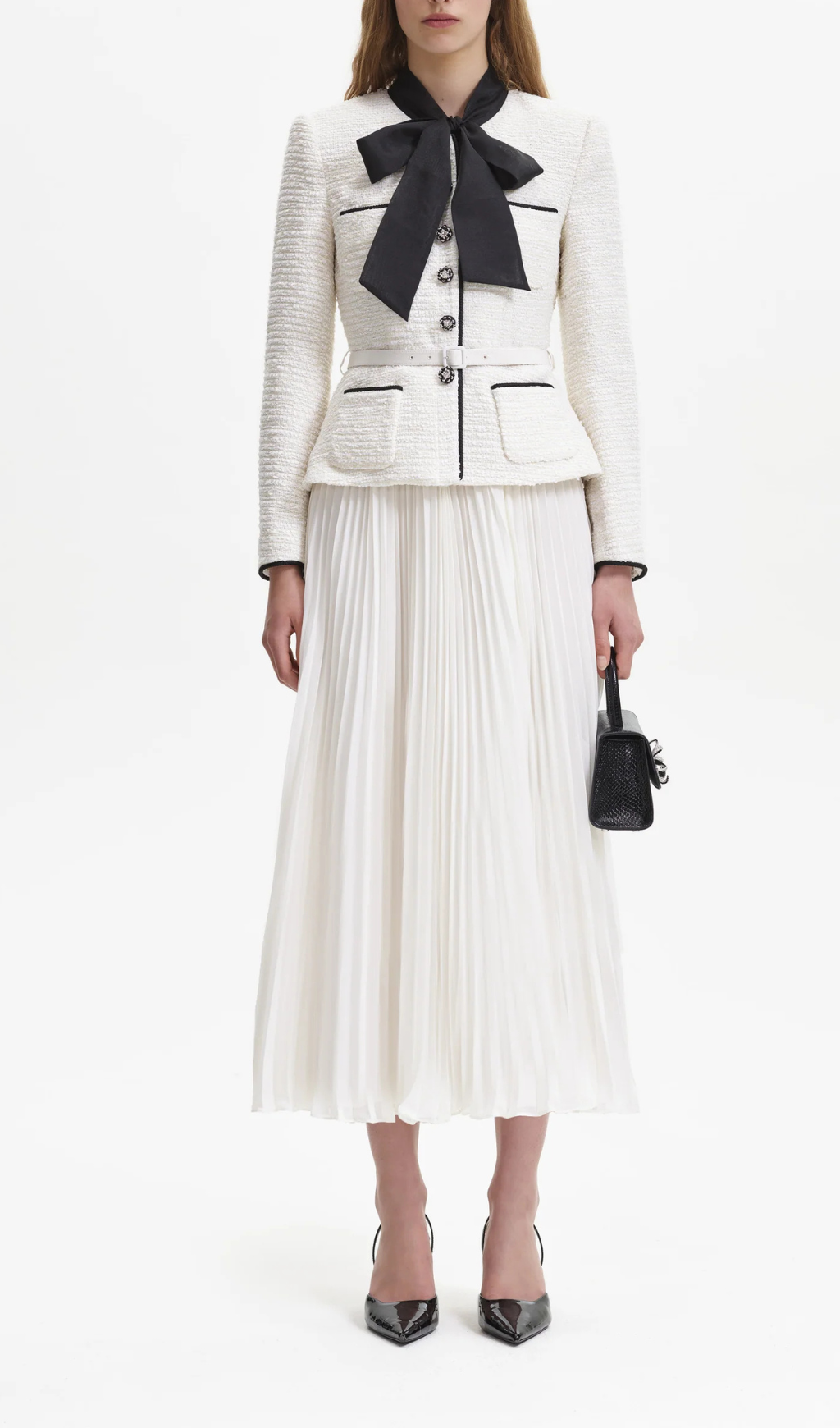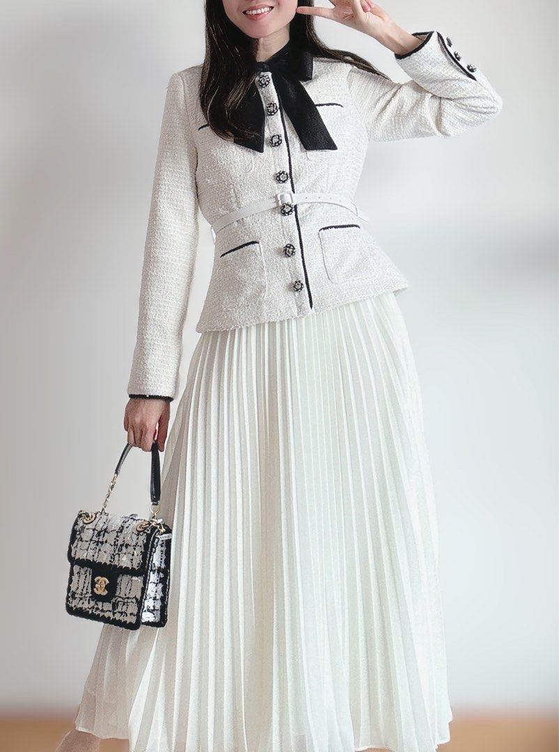 With a cream boucle fabric. it's both chic and cozy. And let's talk about the mock-neck pussy bow - it adds a touch of playfulness to this midi dress. Perfect for any occasion.