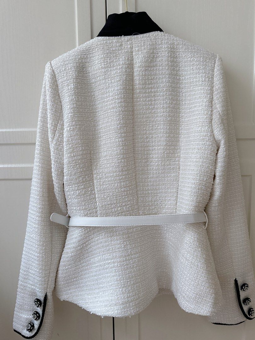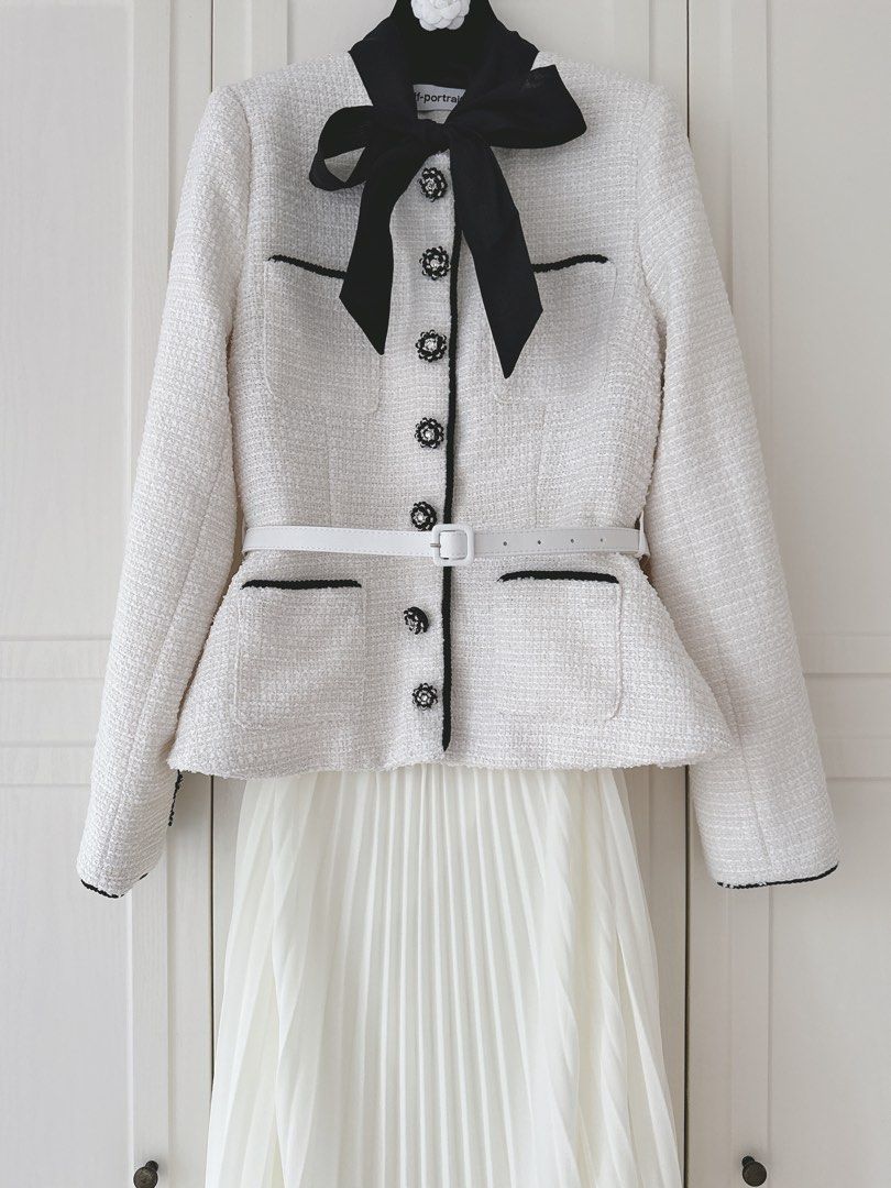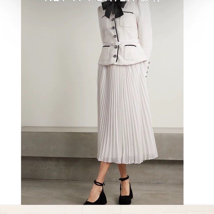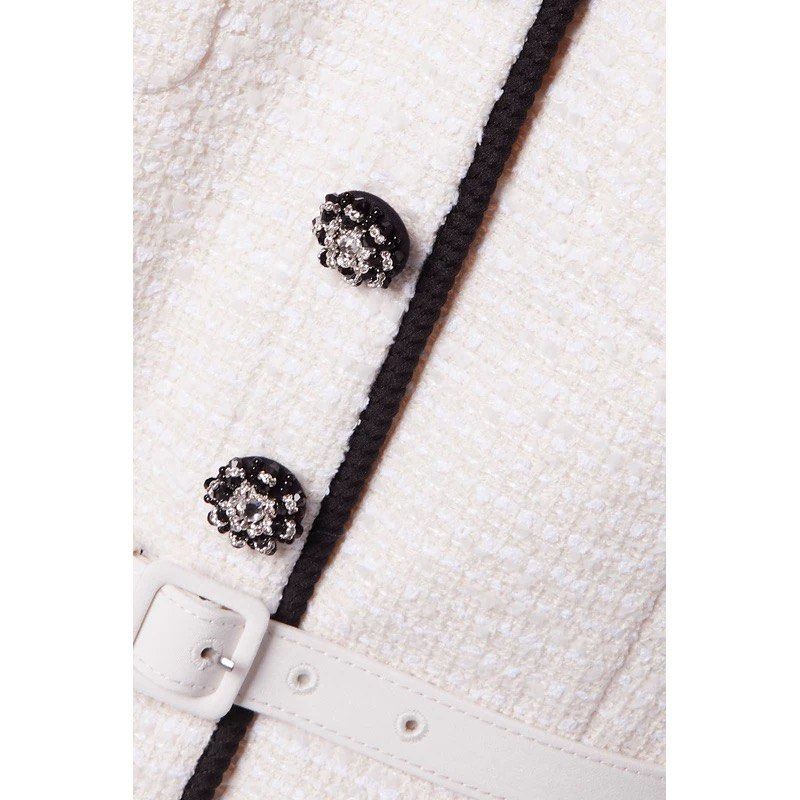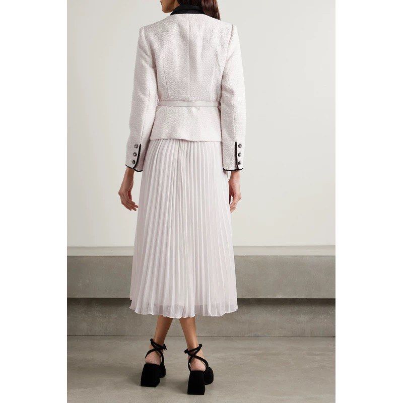 With a cream boucle fabric. it's both chic and cozy. And let's talk about the mock-neck pussy bow - it adds a touch of playfulness to this midi dress. Perfect for any occasion.