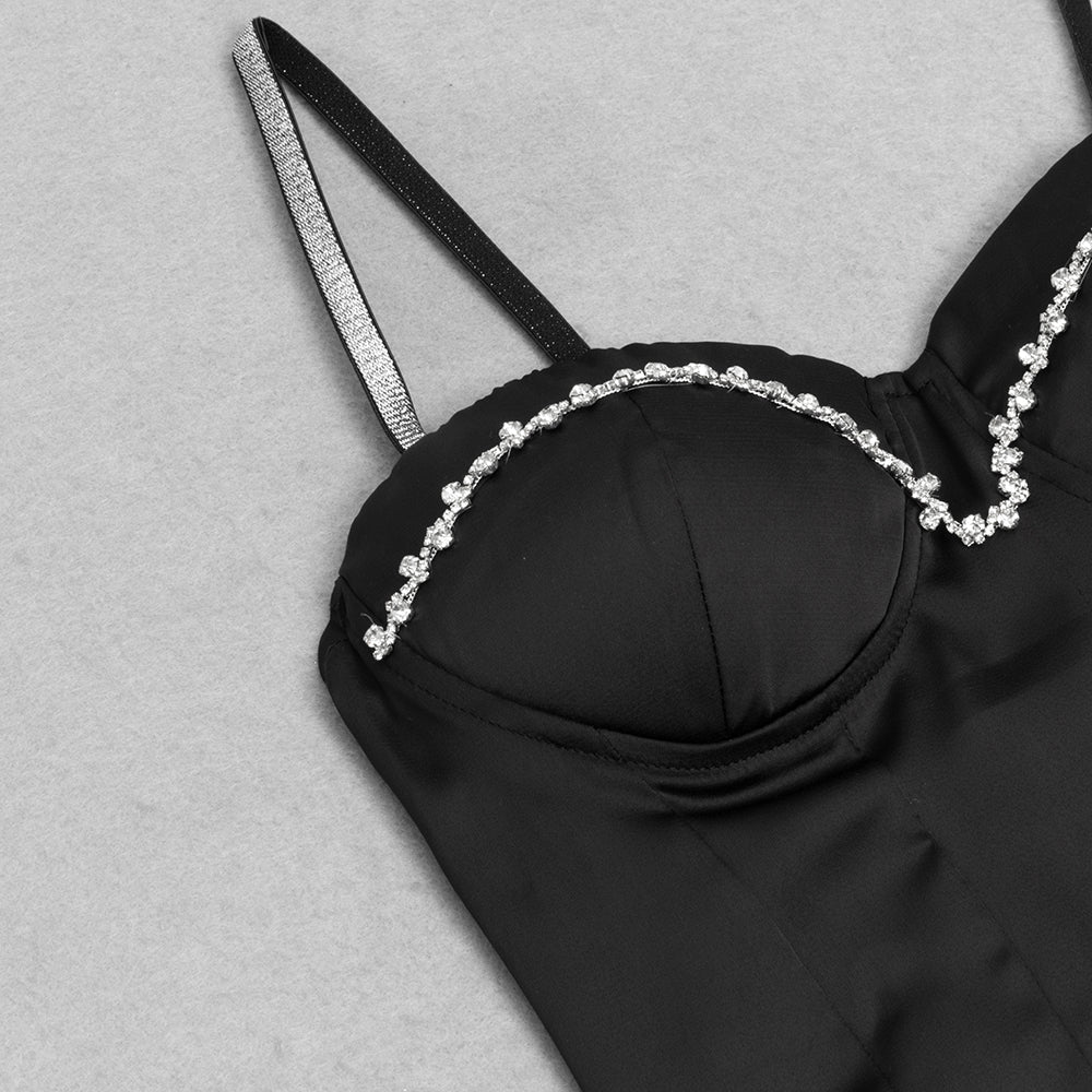 The stunning crystal bustier adds a touch of glamour to this elegant black maxi dress. Embrace your feminine side and turn heads at any special occasion. Elevate your style and confidence with this must-have statement piece!