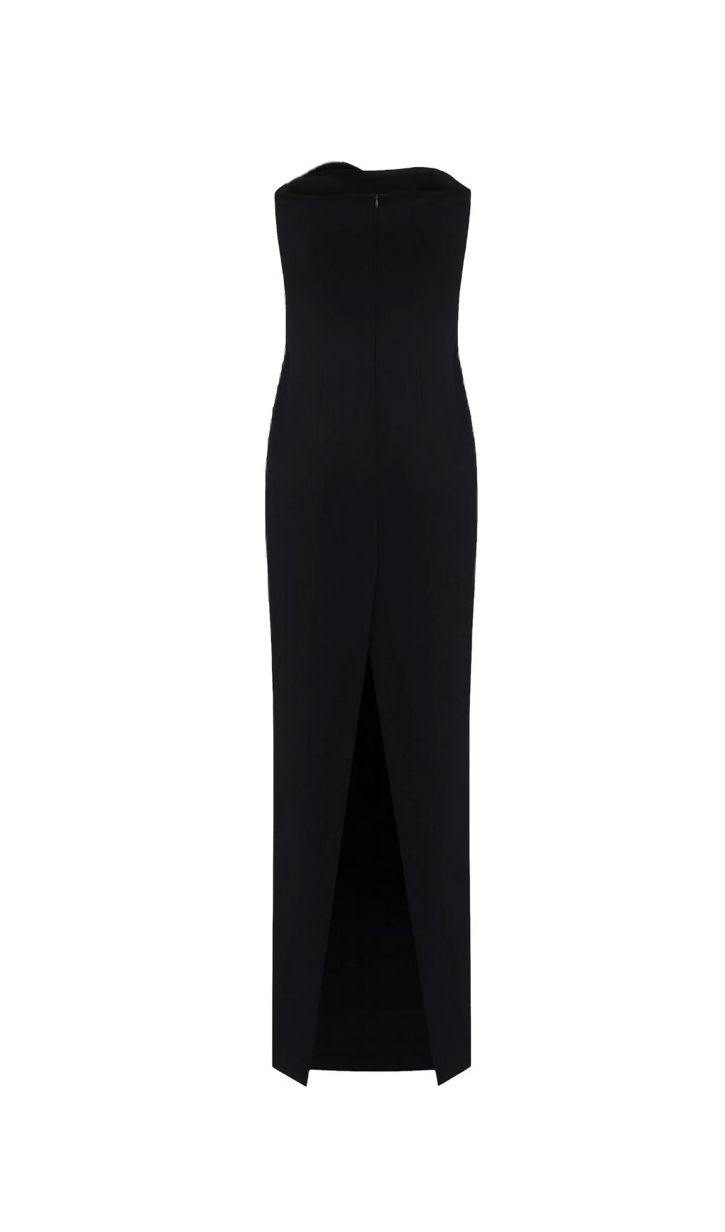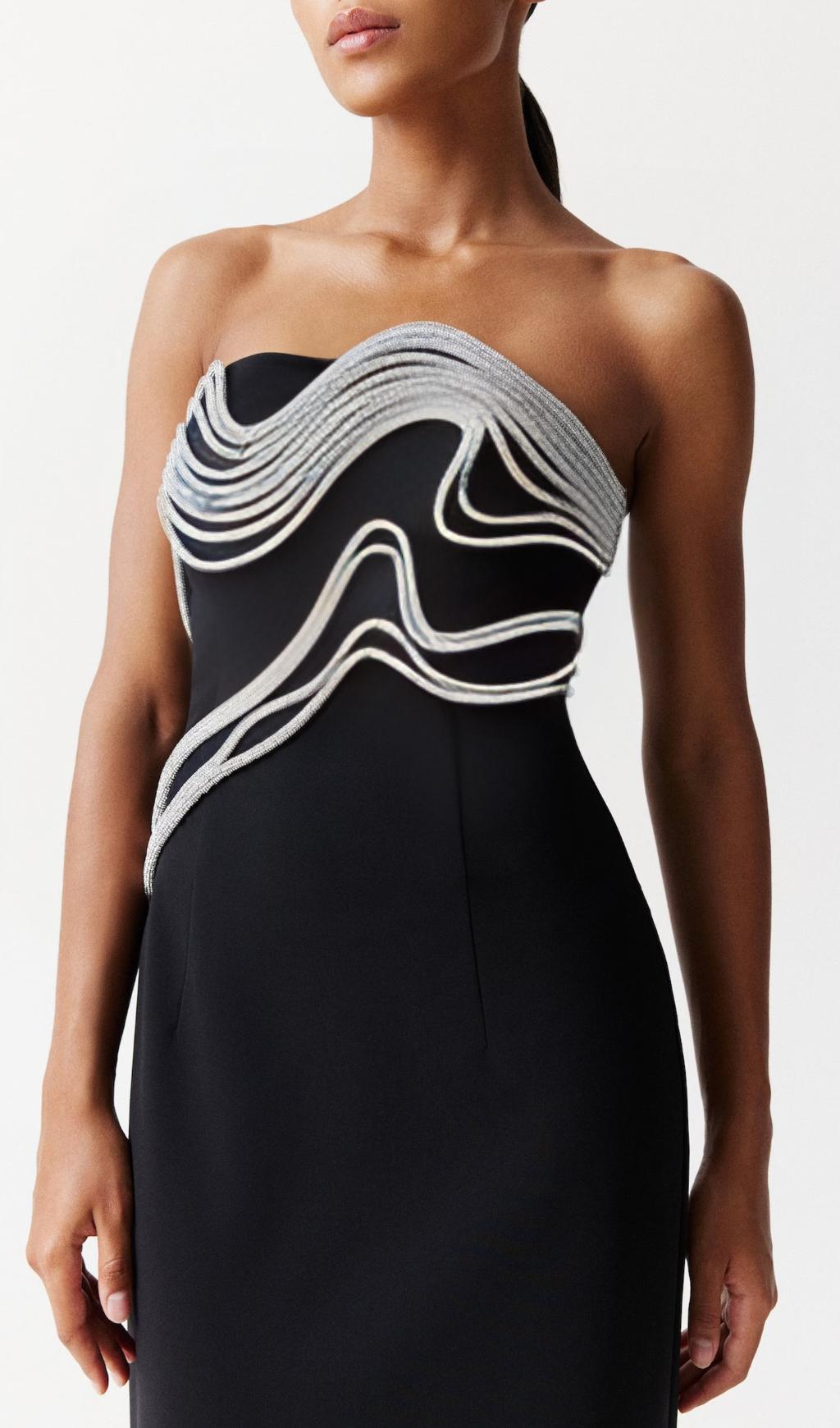Adorned with sparkling crystals. this dress exudes confidence and charm. Make a statement at any event with this bold and elegant piece!"