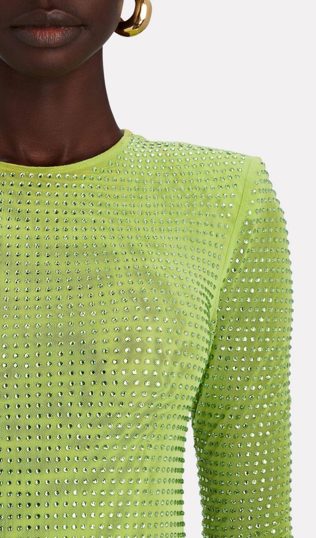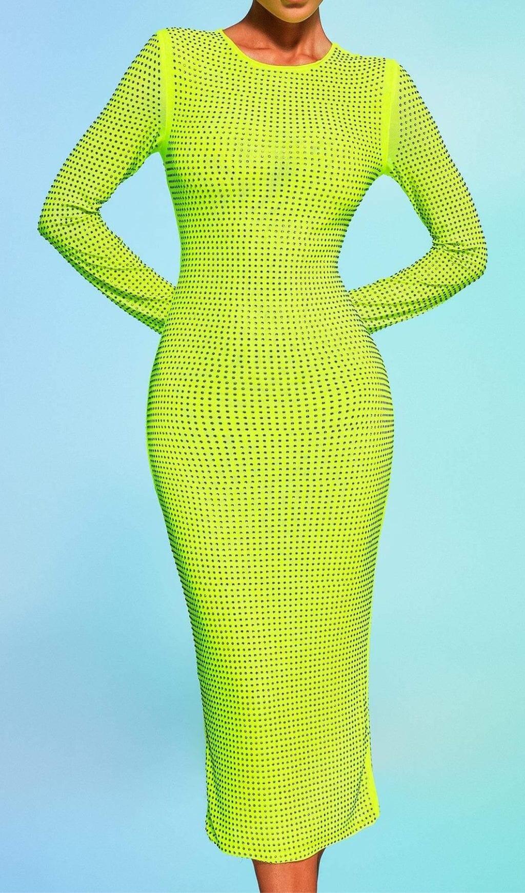 This crystal embellished midi dress in yellow is a true showstopper. With its striking colors and modern silhouette. it is the perfect choice for any special occasion. The dress is adorned with glistening crystals. adding a touch of glamour and luxury. The structural shoulders extend into a curve-hugging silhouette. creating a flattering and elegant look.