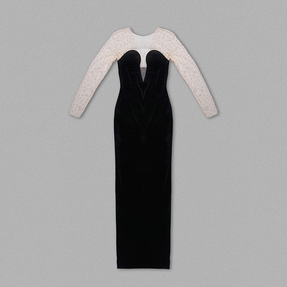 This dress features a mesmerizing crystal mesh design and soft velvet fabric. perfect for adding a touch of glamour to any occasion. Feel elegant and confident in this stunning dress that will surely turn heads.