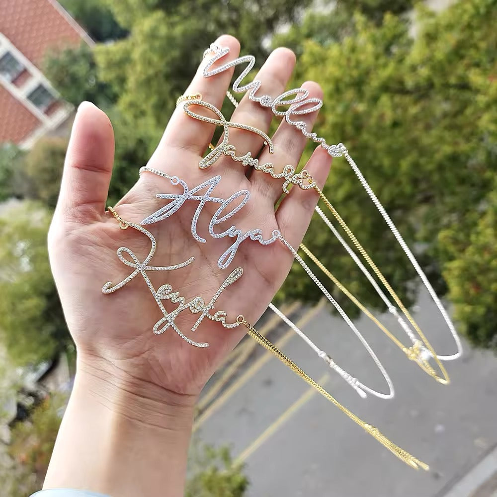 Express your unique style with our Custom Diamond Name Necklace. a perfect blend of elegance and personalization. This crystal name necklace features a stunning script font that beautifully displays your chosen name. making it an ideal piece for any occasion. Crafted from 18K gold-plated stainless steel. this personalized name necklace is durable. hypoallergenic. and perfect for daily wear. The crystal accents add a touch of sparkle. giving it a luxurious look similar to pave diamond necklaces.