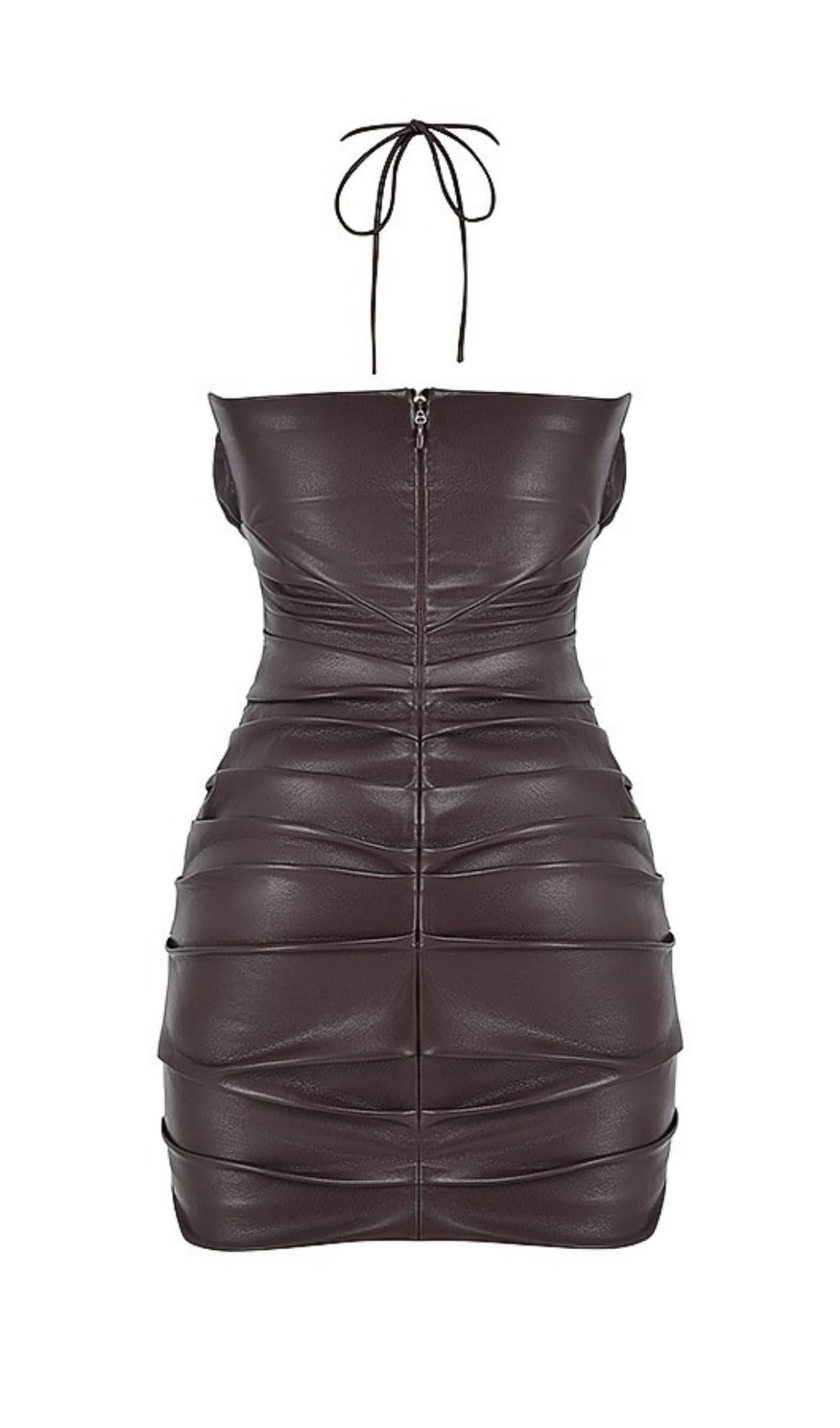The Cut Out Halter Mini Dress in Chocolate is the perfect blend of romance and allure. Made from a soft matte vegan leather in a rich dark brown hue. this dress is both luxurious and cruelty-free. The dress features gentle gathering throughout. with a peephole detail at the bust to showcase your amazing cleavage. The feminine floral embellishment at the neck adds a touch of elegance.