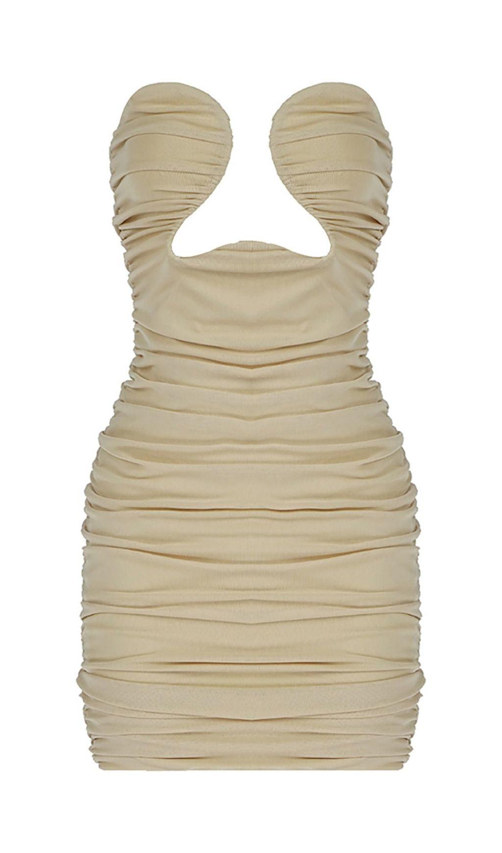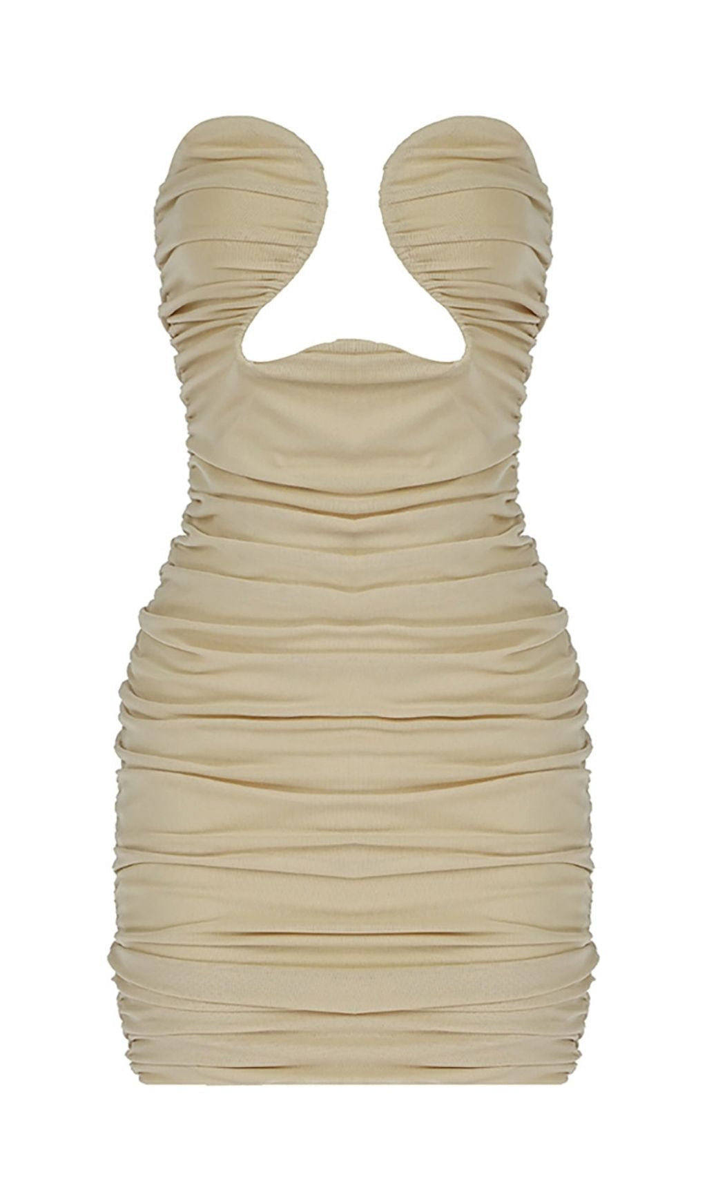 This cut-out ruched bodycon mini dress in white is the ultimate combination of style and allure. With its alluring details and flattering silhouette. this dress is perfect for any occasion.
