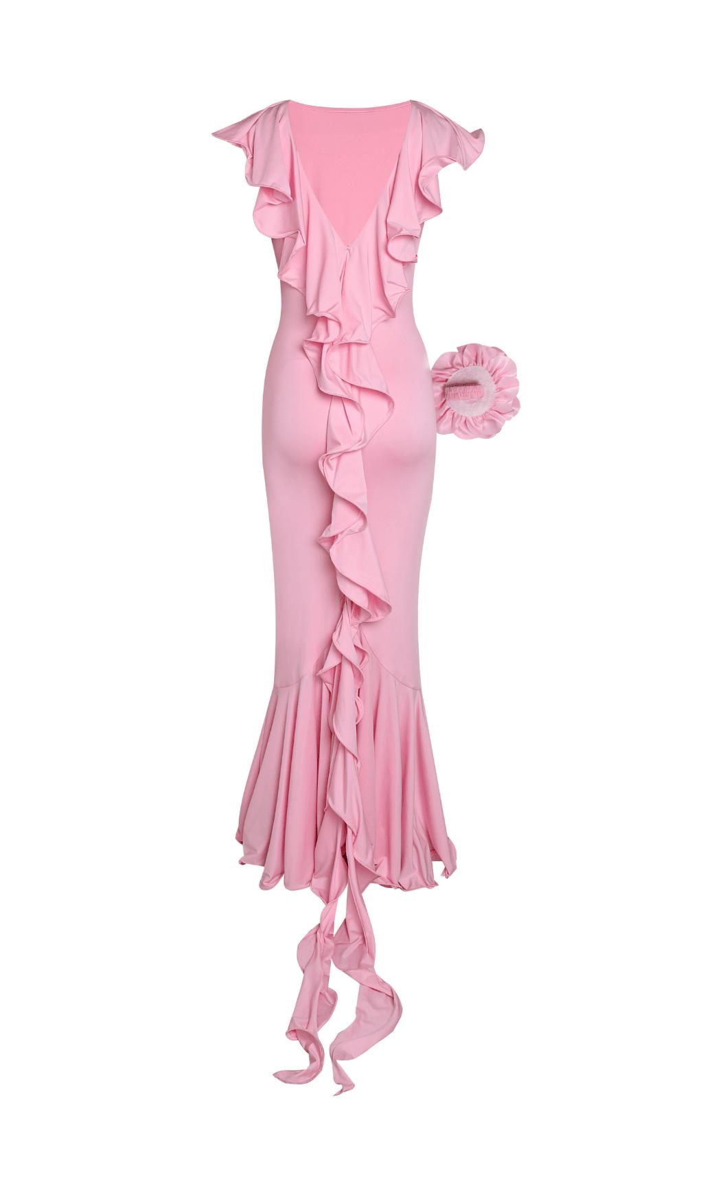 Take your style blooming into the season in this fun. floral-embellished maxi dress. With a deep V-neckline. ruffled details. and a bright floral motif. this flirty. feminine dress is perfect for any special occasion. Make a statement and show off your personality!