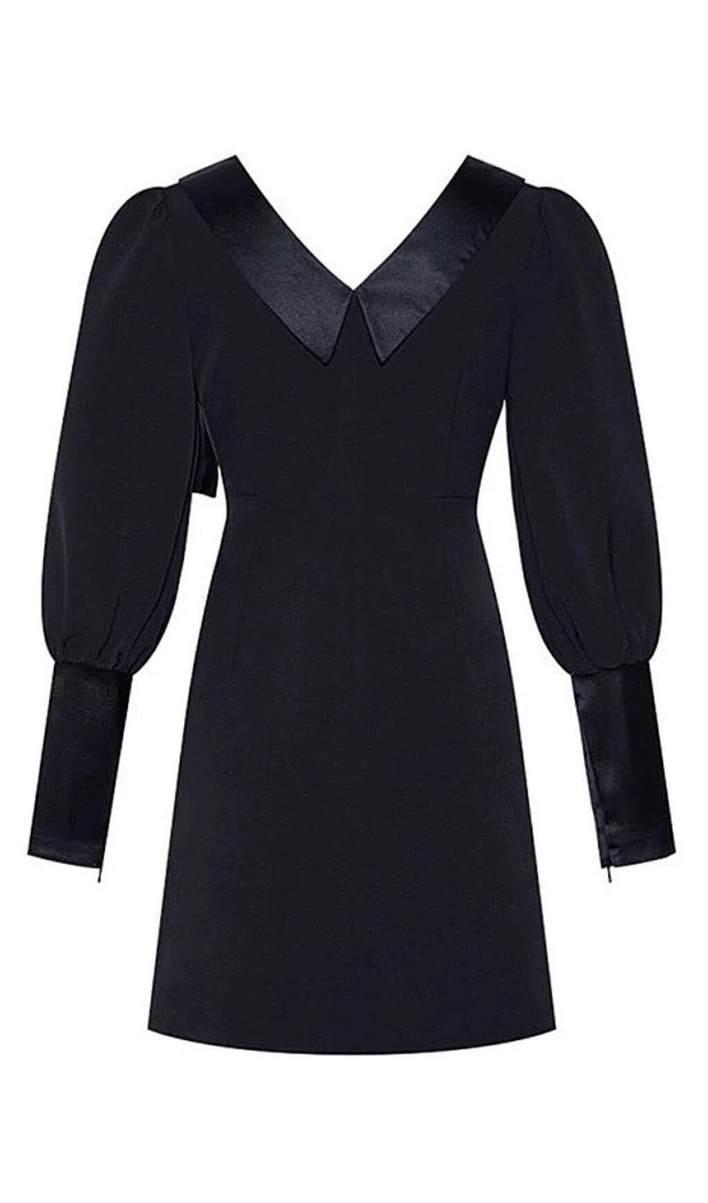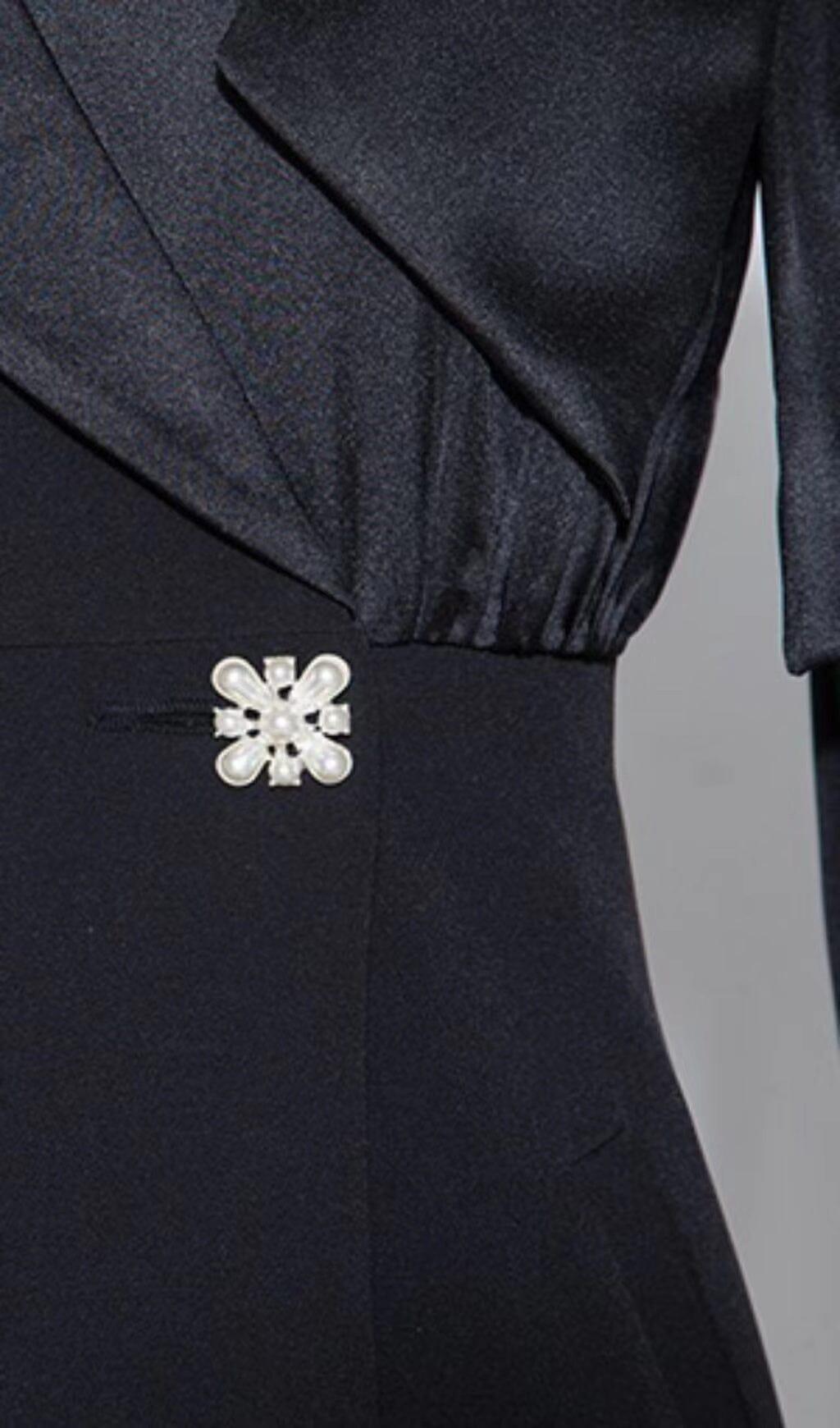 DIAMOND-BUTTON BOW LATERN SLEEVE IRREGULAR SUIT DRESS IN BLACK