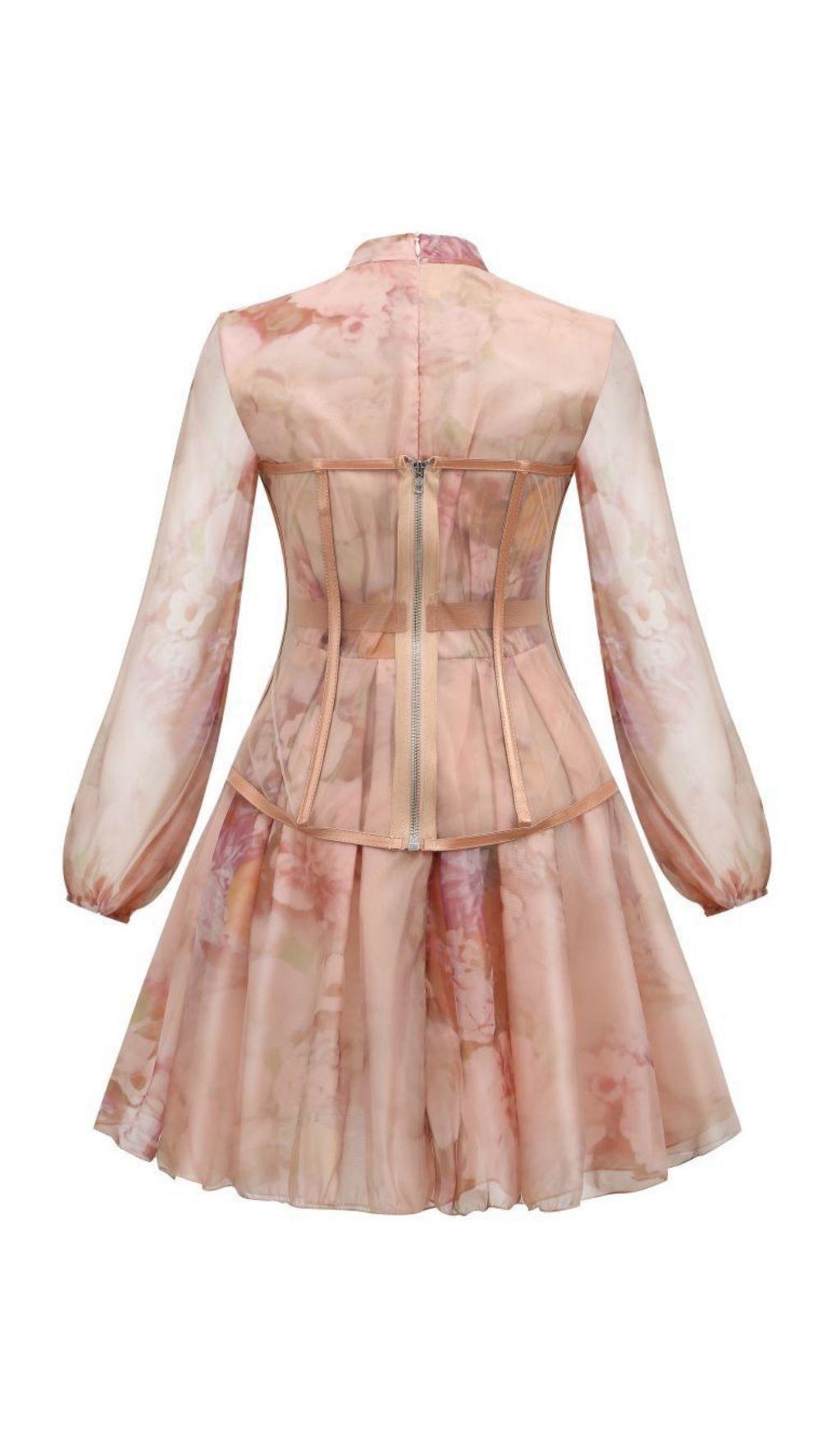 Elevate your style with our High Neck Bell Sleeve Mini Dress in Rose Silk With Nude Structured Corset. This dress is designed to make you feel confident and elegant. no matter the occasion.