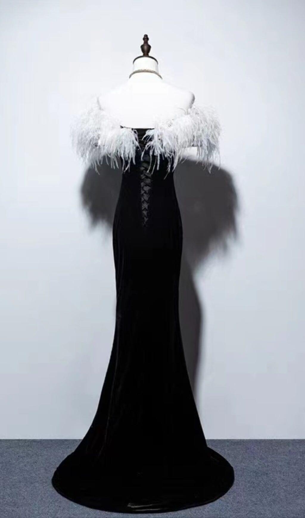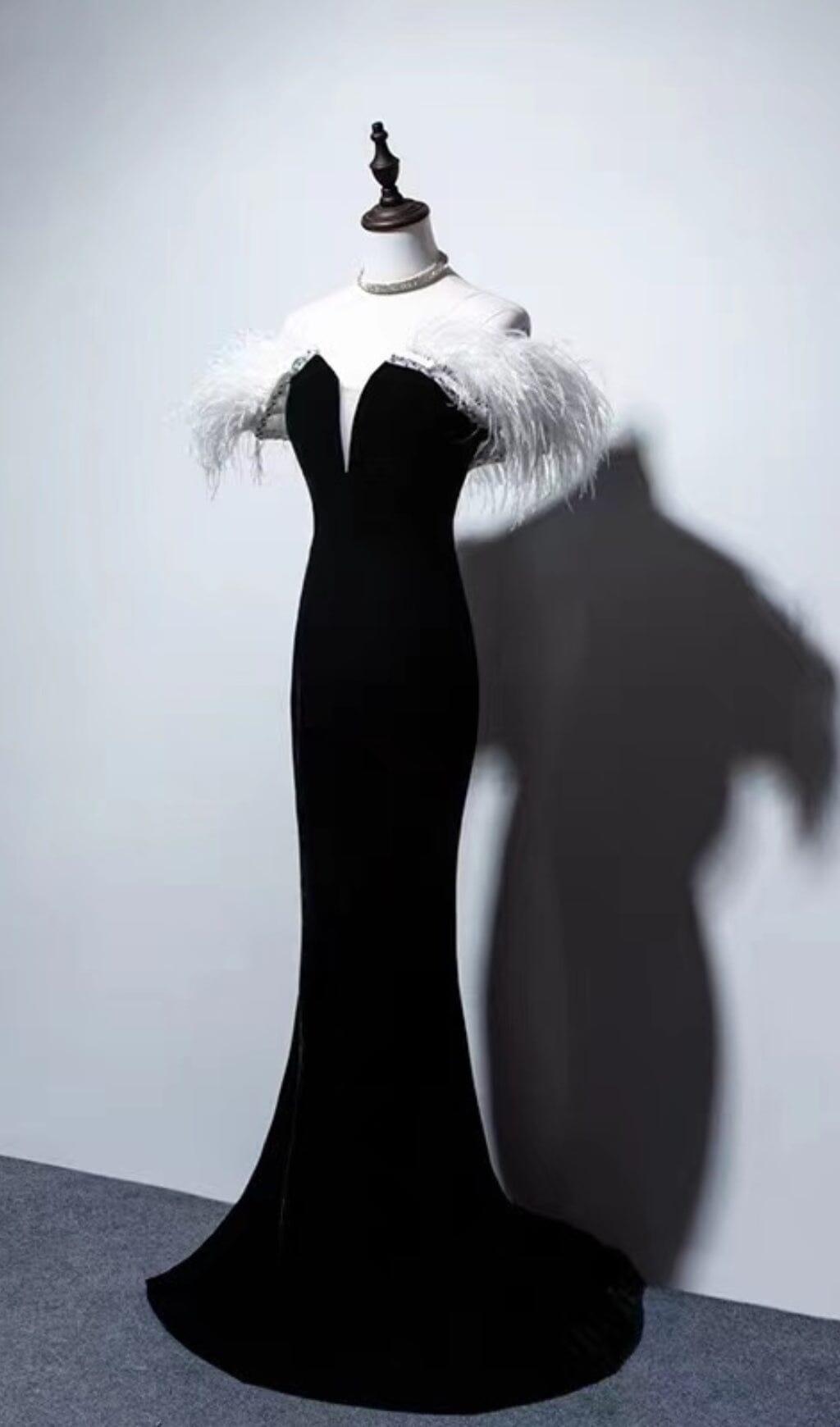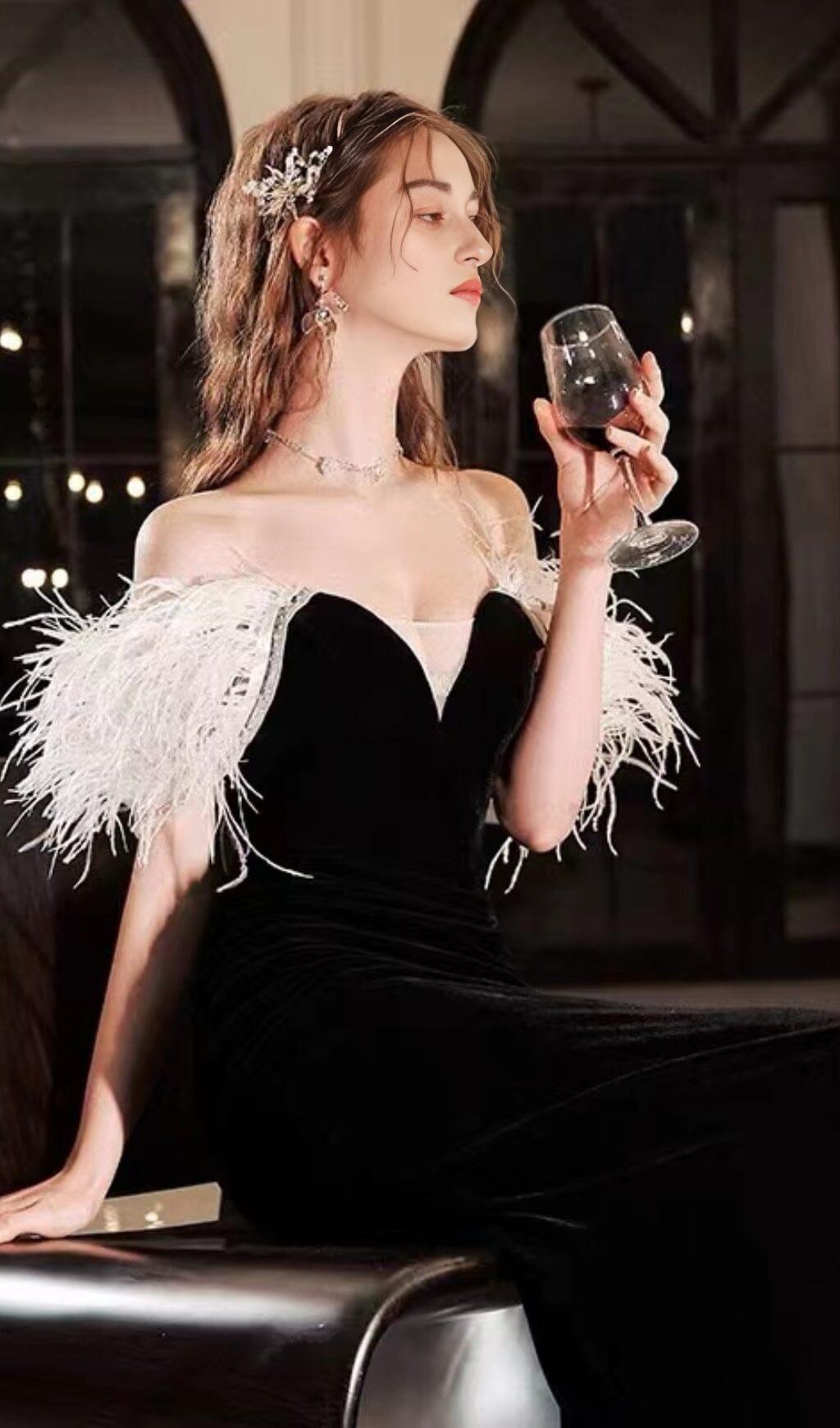 The narrow V-shaped collar at the neckline beautifully accentuates your elegant neck. giving it a slender appearance. The black fishtail long skirt adds an element of sophistication and allure. exuding a classic and delicate beauty. The feathers delicately placed along the chest and back create a captivating contrast against the black. adding a touch of playfulness and charm to the overall look.