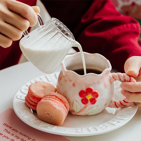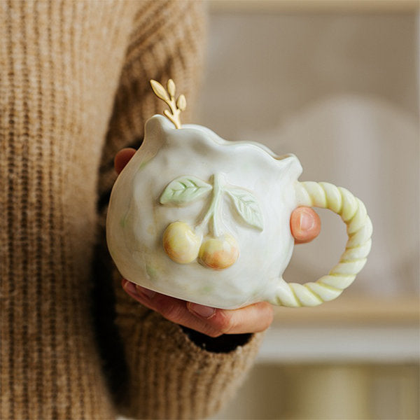 Our Embossed Hand-Painted Coffee Mug is a beautiful addition to your morning coffee routine. Made of high-quality ceramic. this mug is durable and features an embossed design of a red flower or yellow cherry. The hand-painted finish adds a touch of elegance and uniqueness to each mug. making it a perfect gift for any coffee lover. Its generous size allows you to enjoy a large cup of coffee or tea. and the comfortable handle makes it easy to hold.
