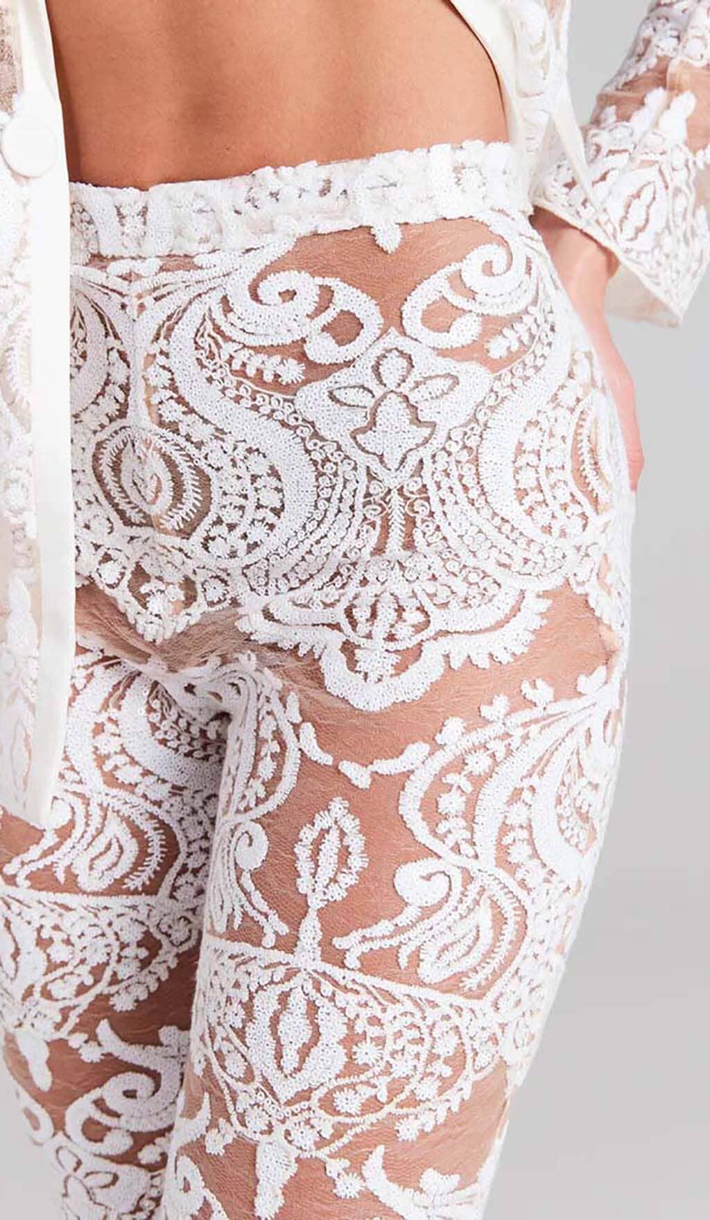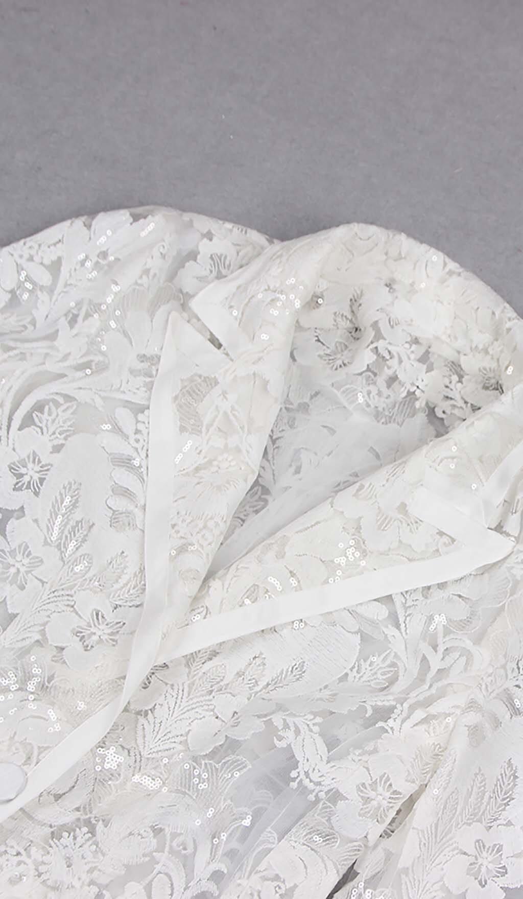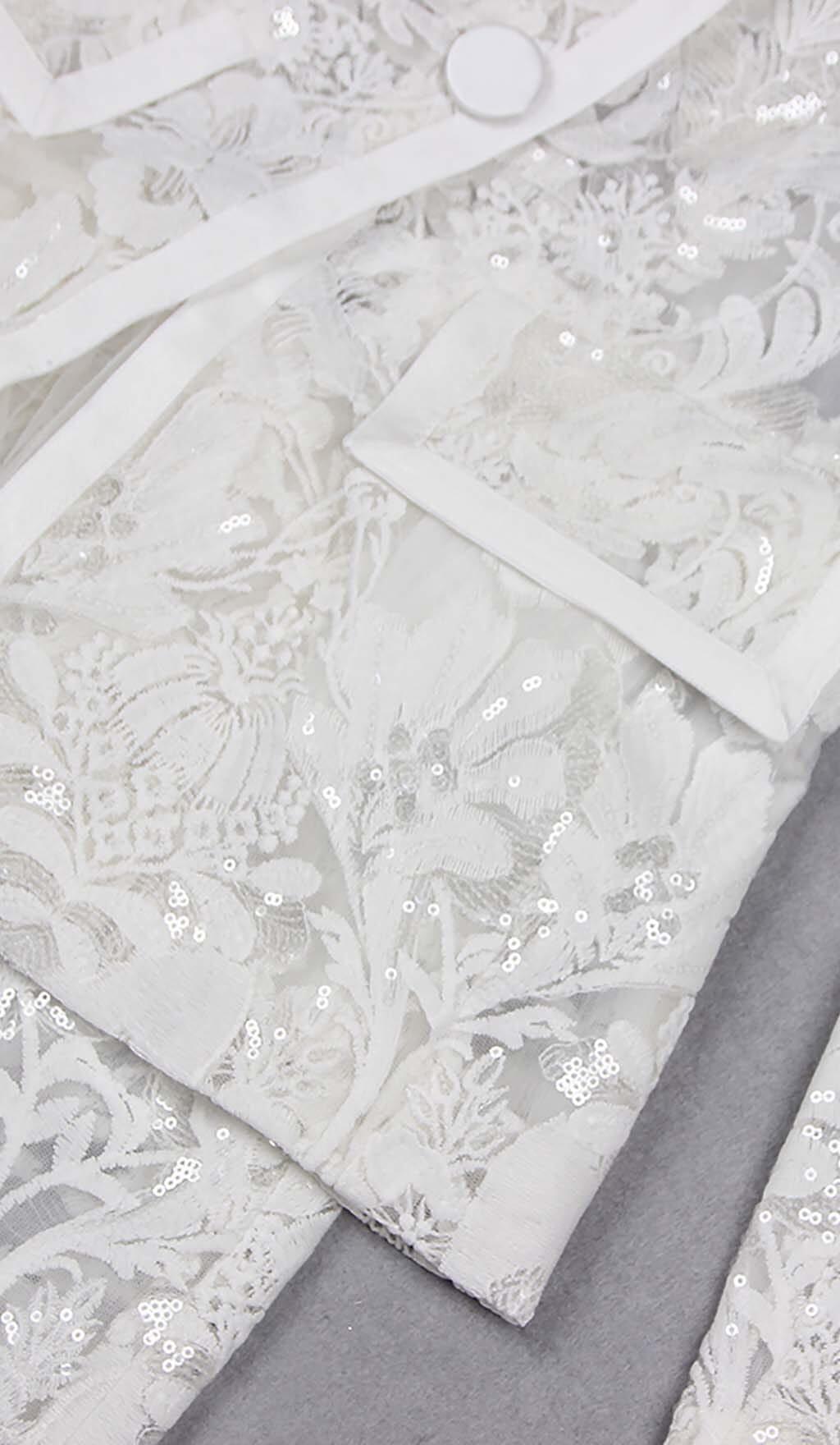 Make a statement with our Embroidered Lace Mesh Jacket Suit in White. Complete the look with lace-up heels and a bold red lip. and get ready to exude timeless elegance at any event.