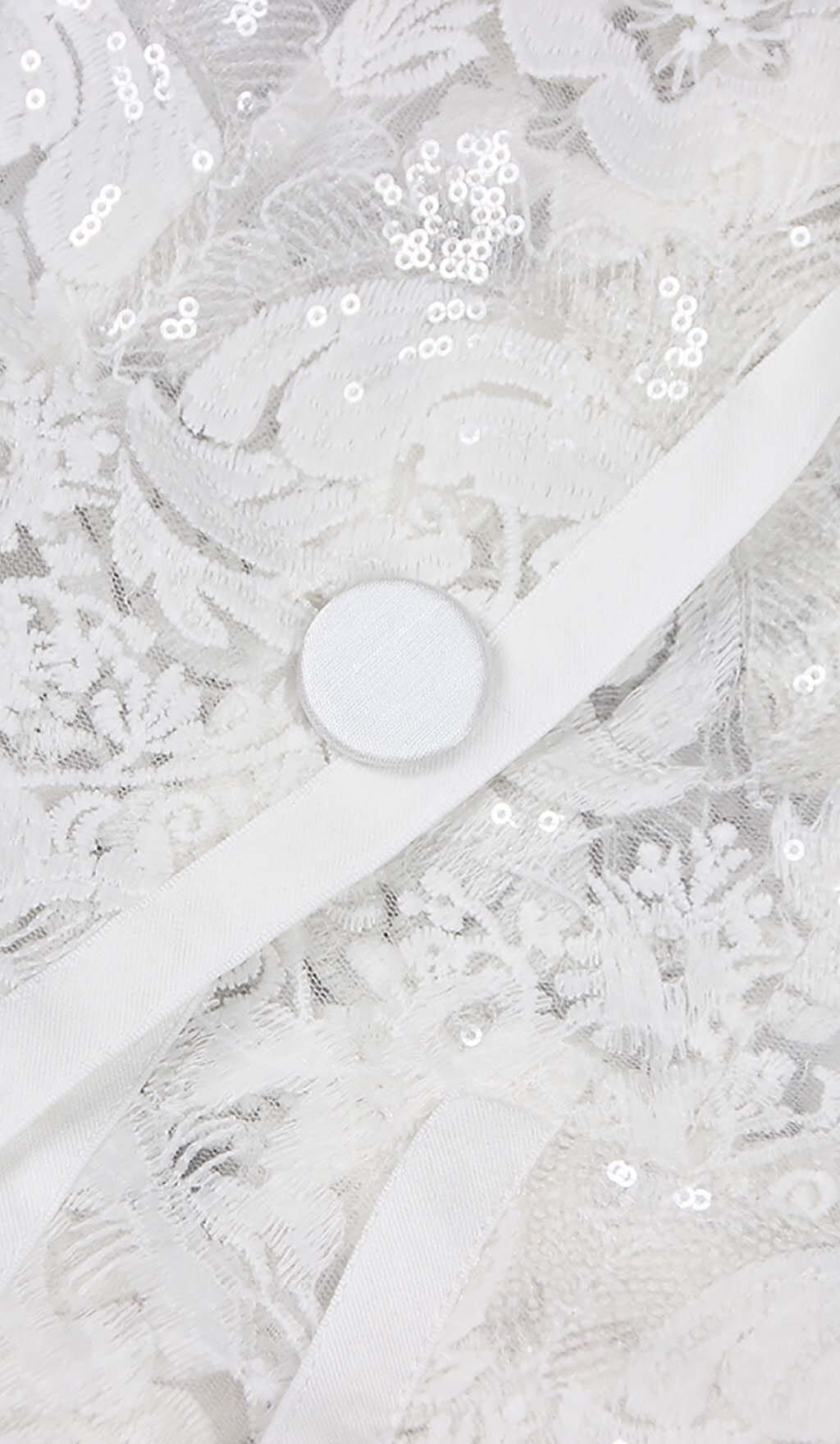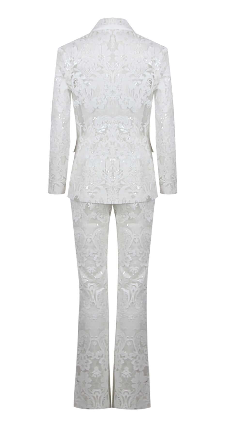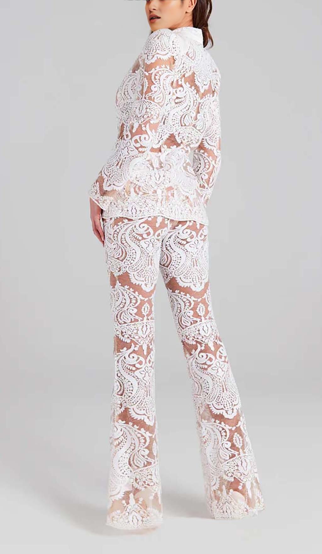 Make a statement with our Embroidered Lace Mesh Jacket Suit in White. Complete the look with lace-up heels and a bold red lip. and get ready to exude timeless elegance at any event.