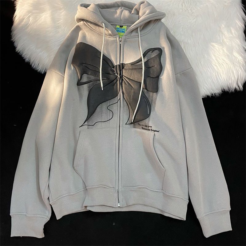 Loose Bowknot Printed Zipper Jacket Hoodie
