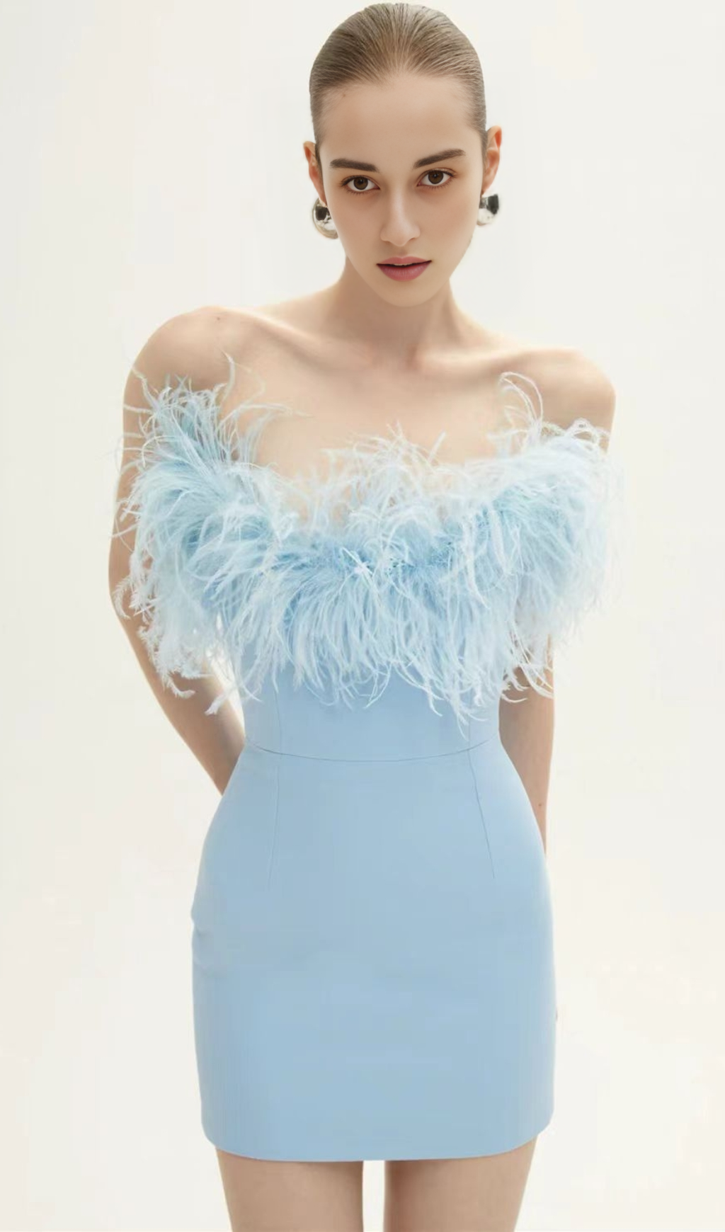 Stand out in this vibrant feather mini dress! With its royal blue color. you'll be the center of attention. And let's not forget the fun. playful touch of feathers that will make you feel like a true fashionista.