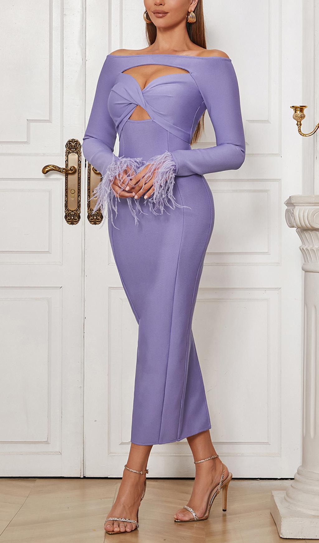 The bold. daring cut outs and feather sleeves will make you feel fearless and ready to conquer any event. Don't just blend in. stand out with this statement dress!