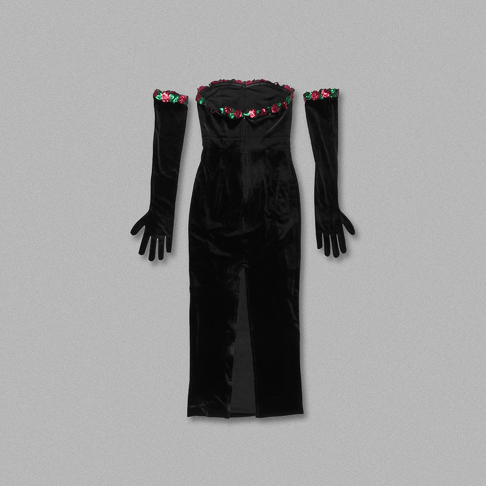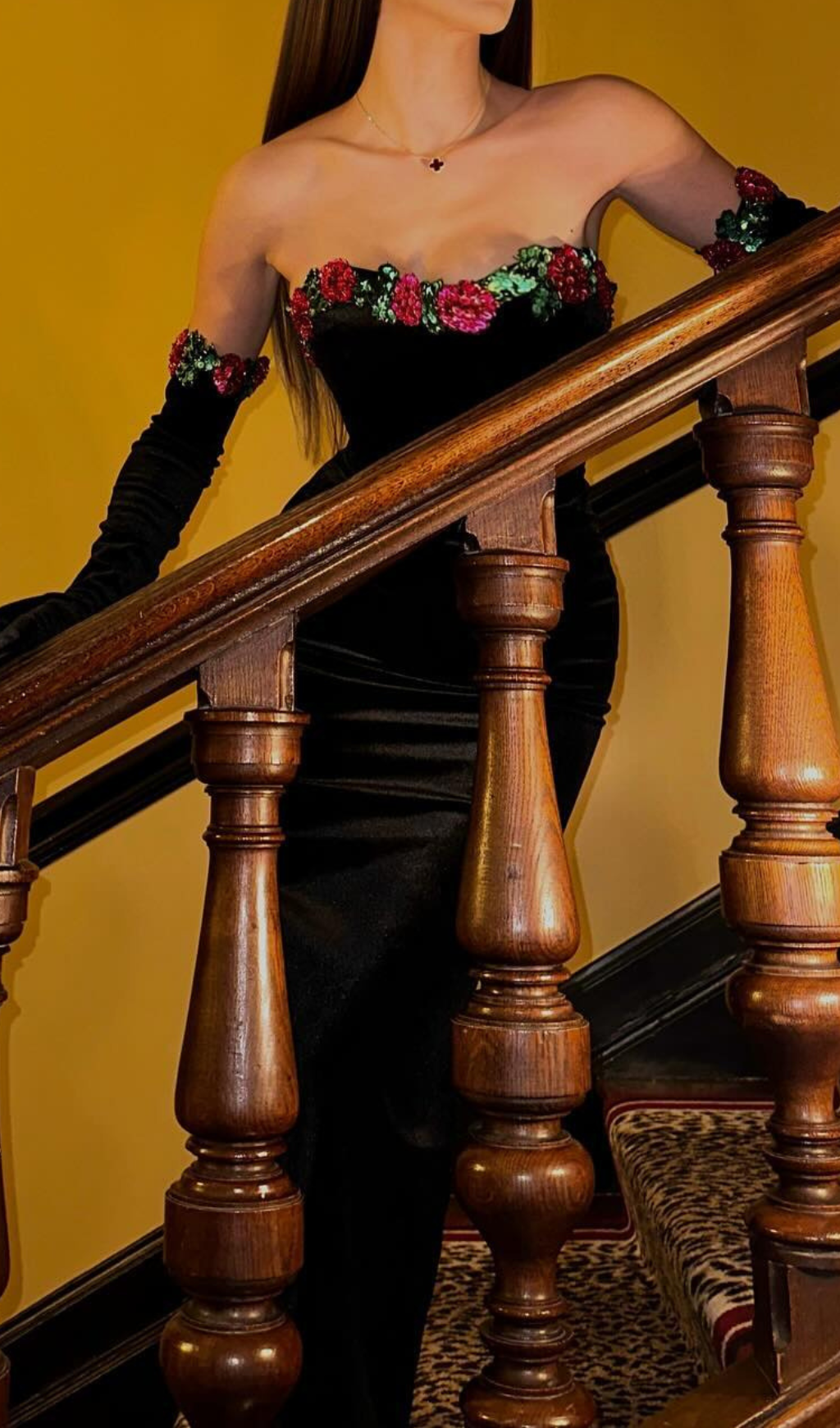 This stunning black dress features intricate floral detailing and a flattering strapless design. Made with luxurious velvet material. it's perfect for any special occasion. Make a statement and turn heads in this elegant and eye-catching dress!