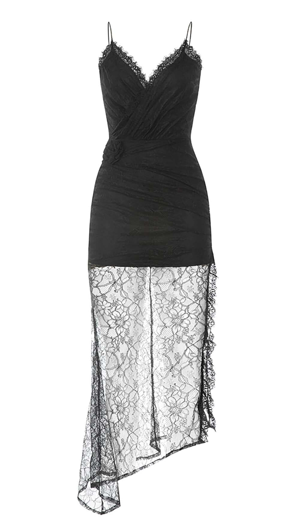 Make a statement at any event with this stunning black midi dress. With its intricate floral appliques and delicate lace fabric. you'll be sure to turn heads and stand out from the crowd.