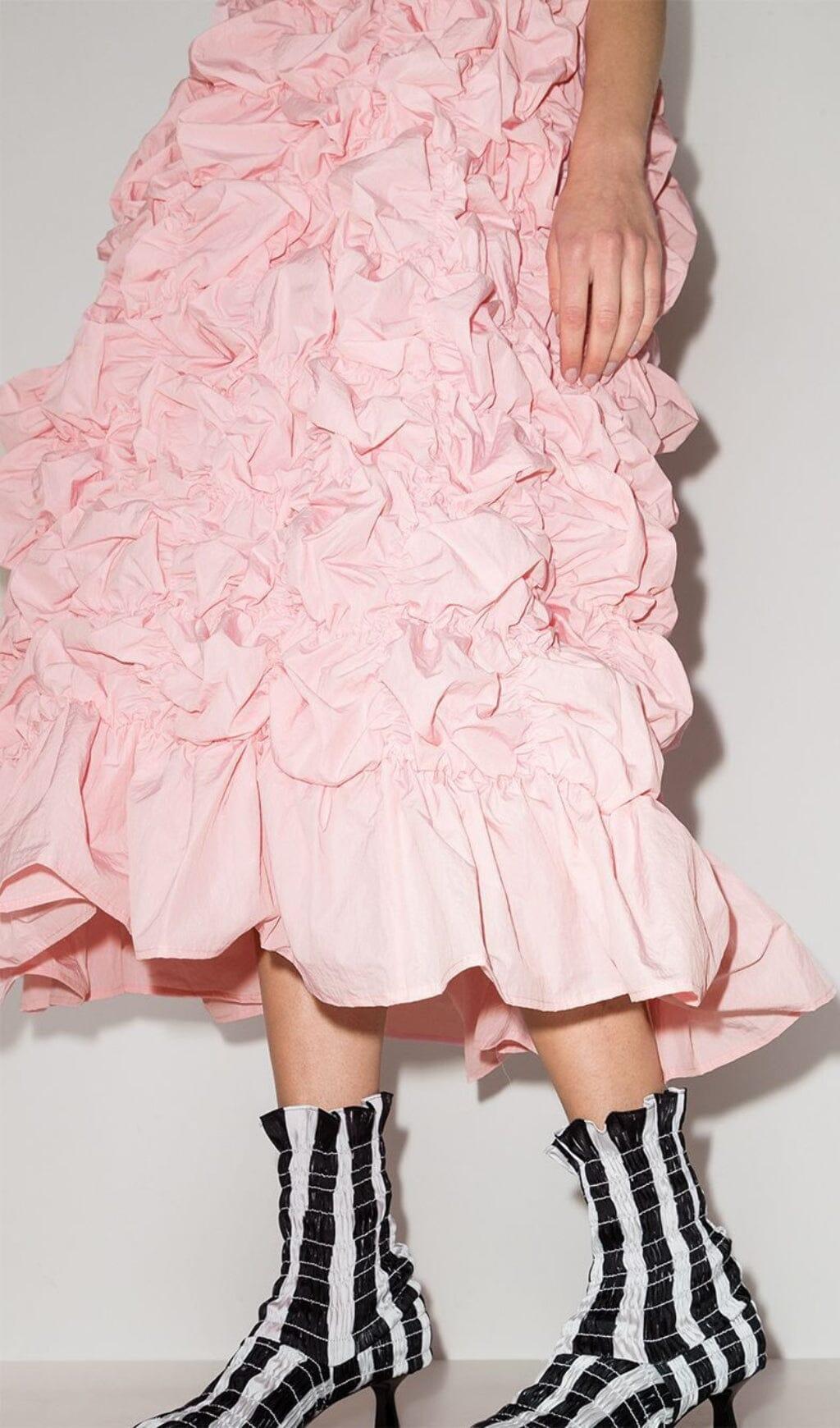 Make a bold and beautiful statement with the Folding Ruffled Midi Dress in Pink. This stunning dress features a feminine and flirty ruffled design that is sure to turn heads. The unique folding detail at the waist adds a touch of elegance and sophistication. making it perfect for any formal occasion.