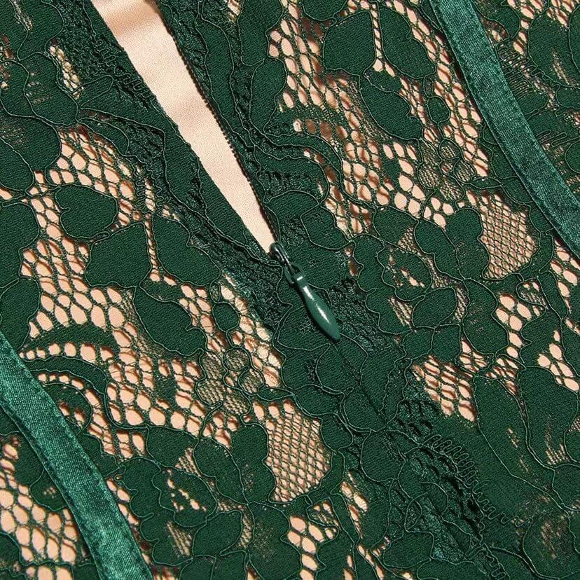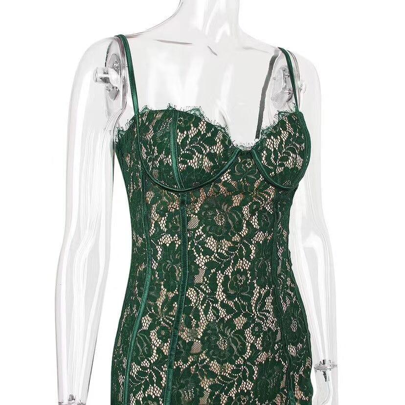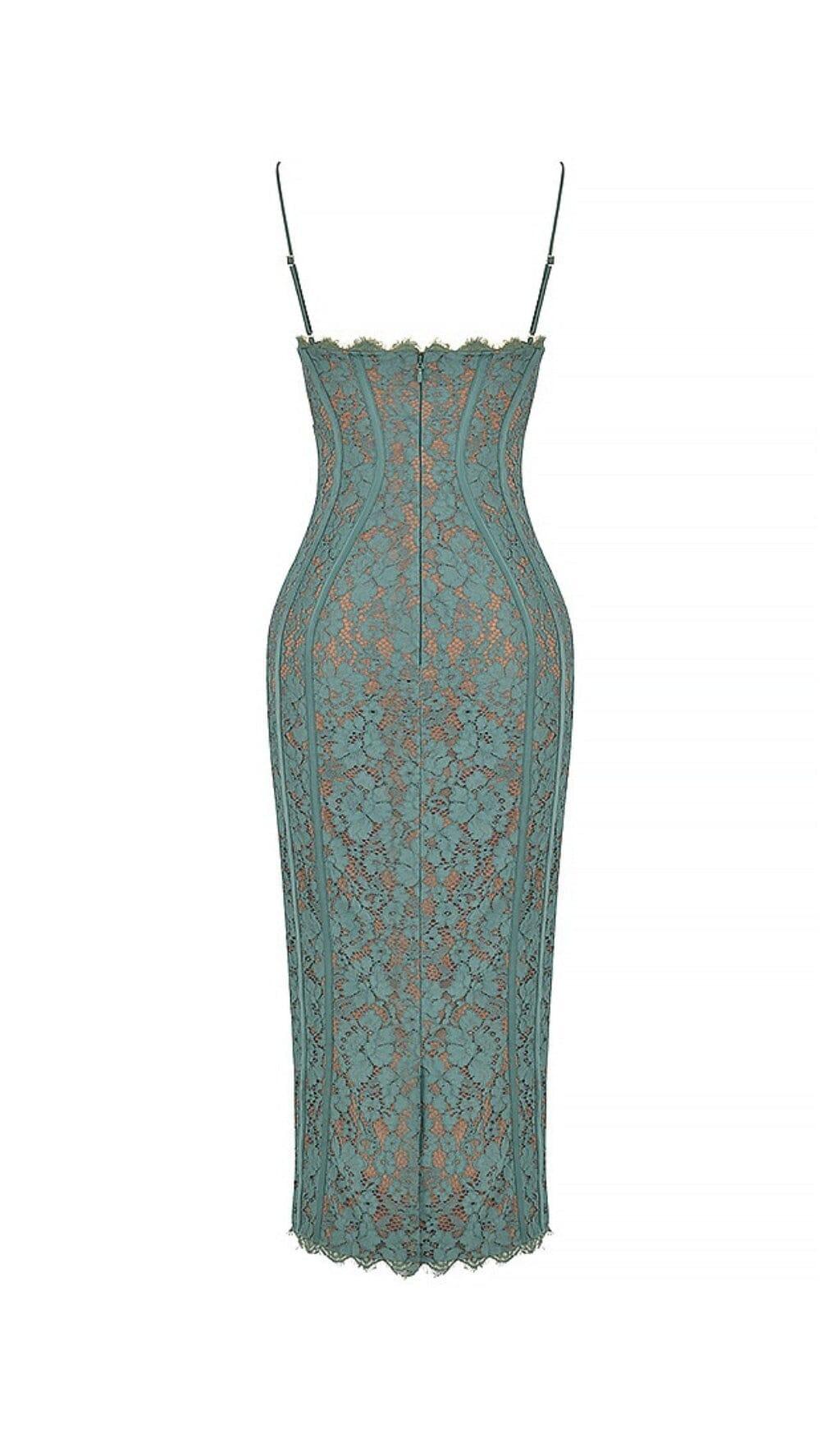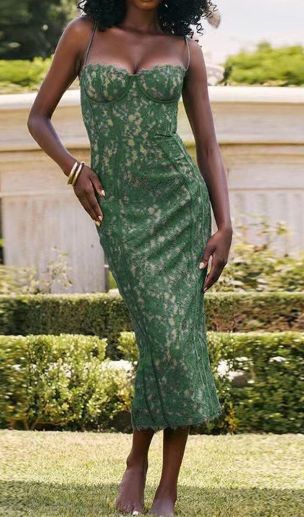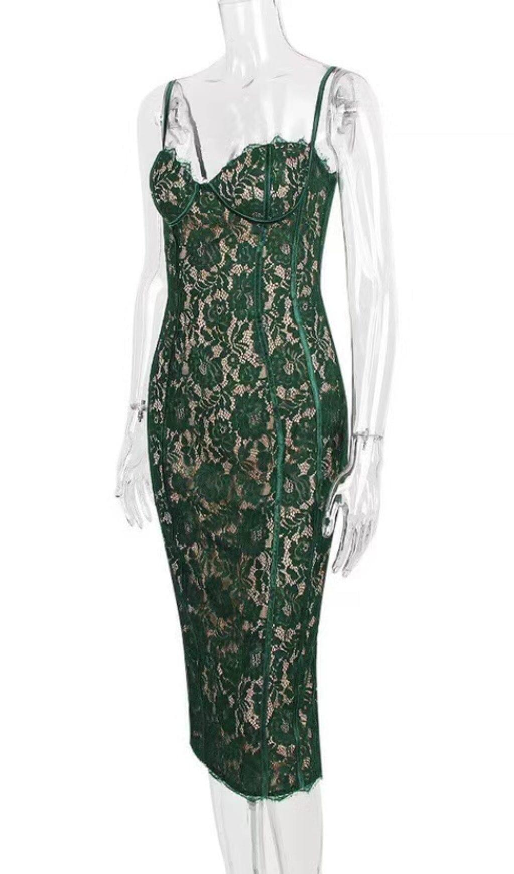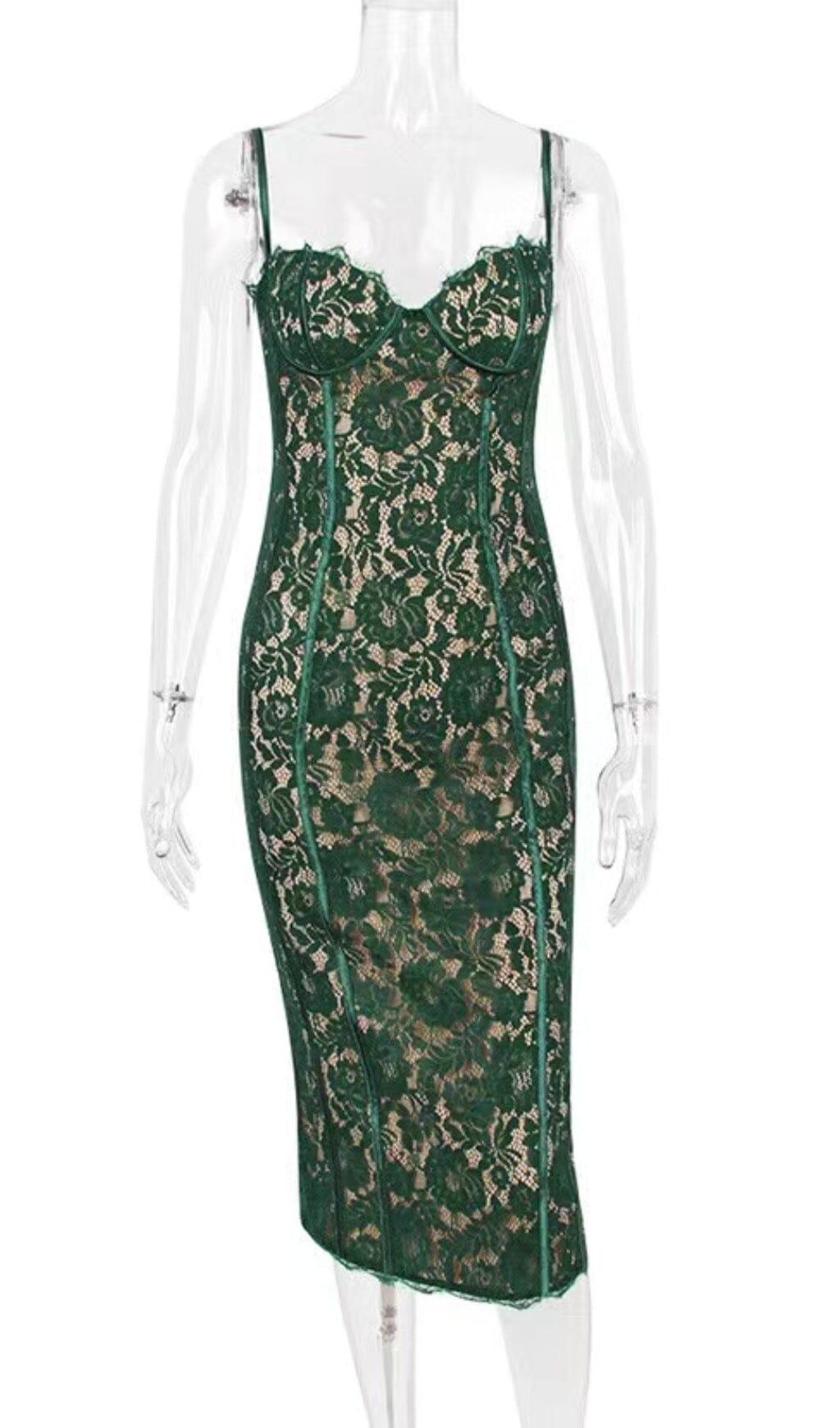 If you loved our mini dress. you'll love our midi length version. The Forest Lace Midi Dress is a stunning piece cut from delicate lace in a fresh forest hue. It is backed in our figure-enhancing power mesh for modest coverage and the closest of fits. This dress is designed to make you feel confident and beautiful. with its flattering silhouette and feminine details.