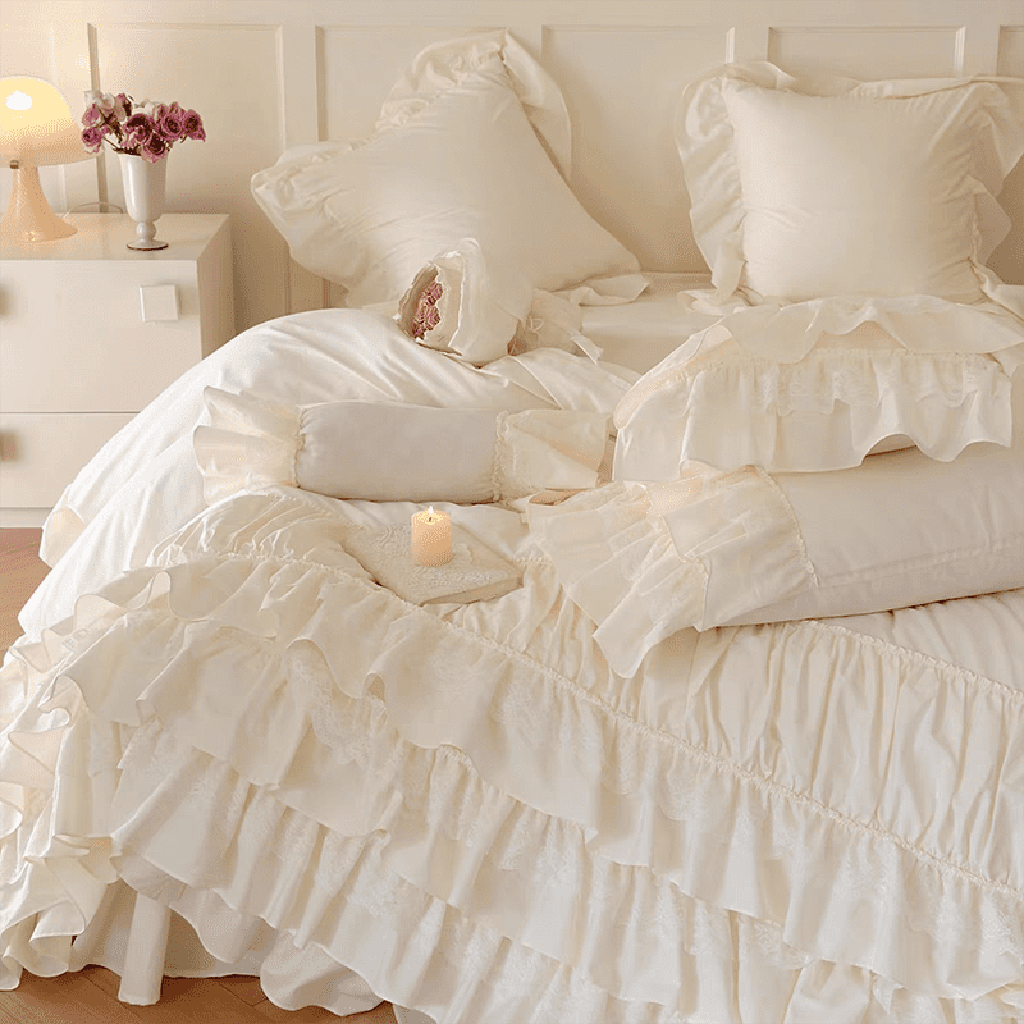 Step into a world of elegance and charm with this dreamy bedding set. Crafted from 100% soft. breathable cotton. The delicate lace and ruffled details give your bed a touch of vintage aura. making it look like a scene from a fairy-tale.