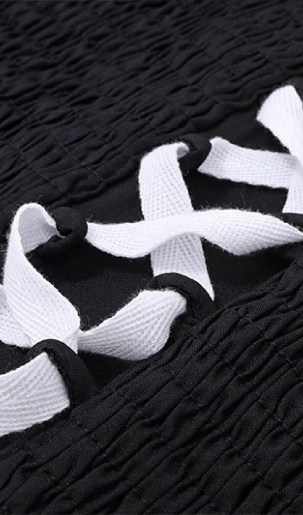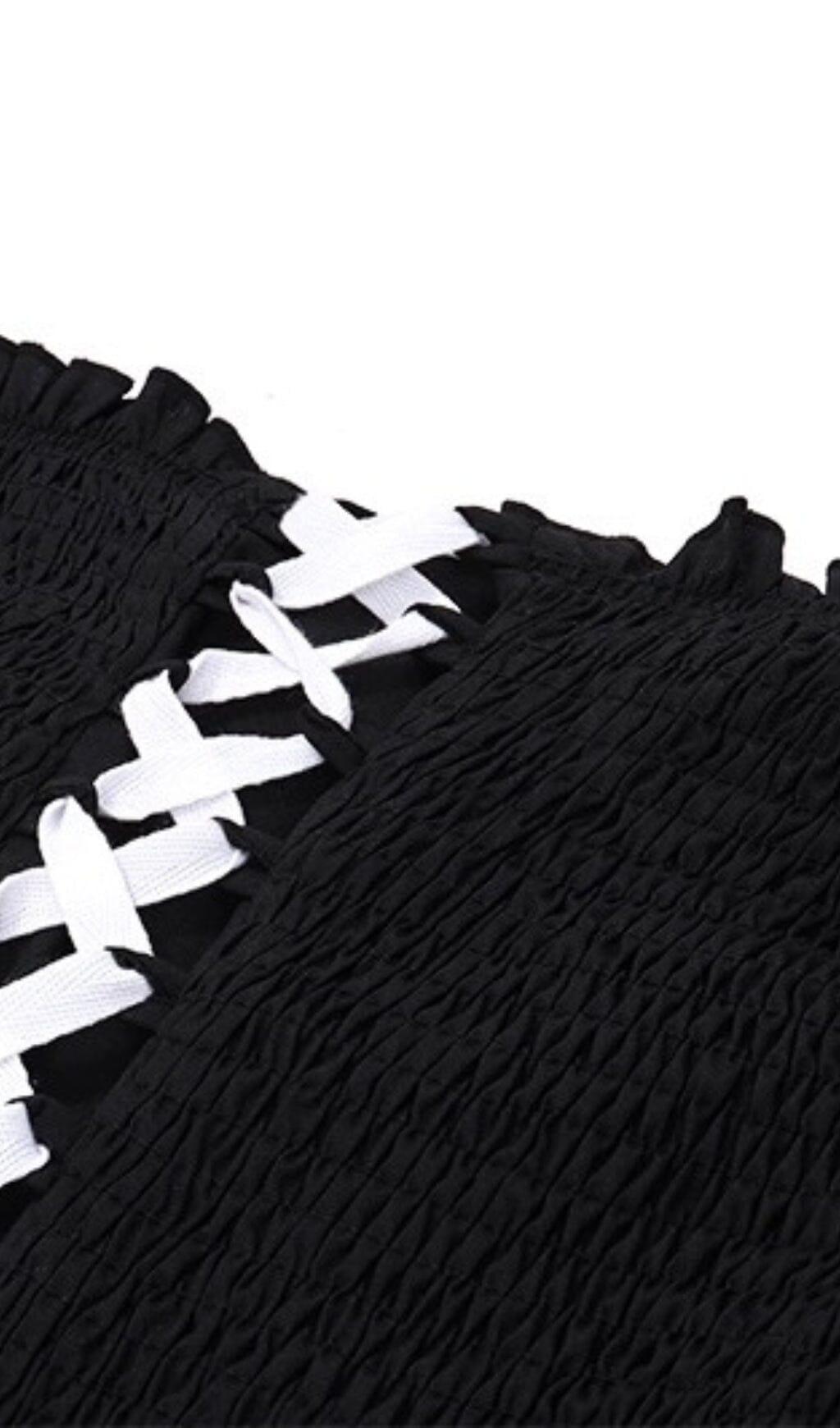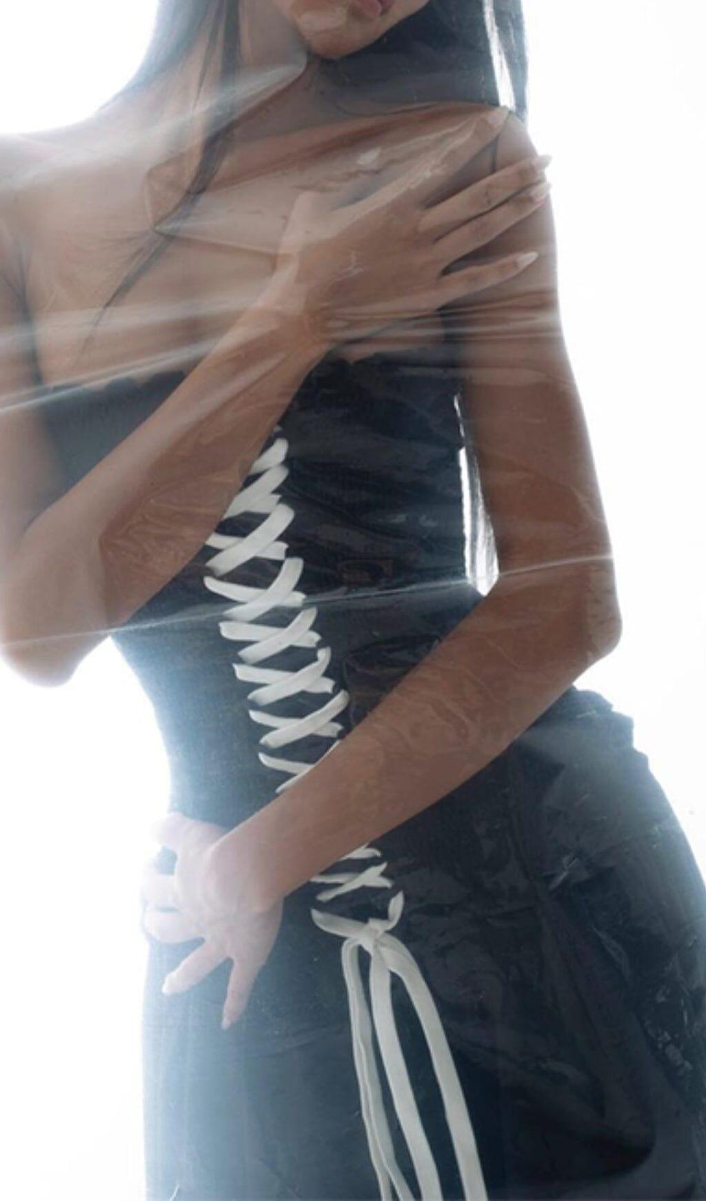 Elevate your style with this stunning strapless maxi dress in black. Designed to make a statement. this dress features edgy front lace-up detailing that adds a touch of allure and sophistication. The floor-length silhouette exudes elegance and creates a captivating look for any occasion.
