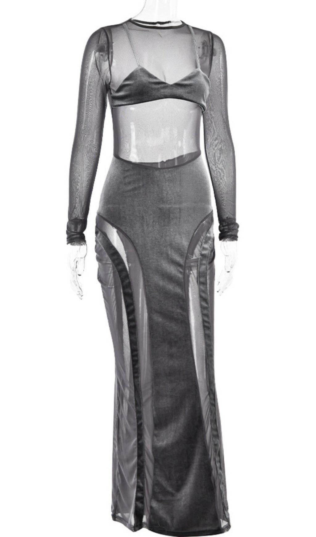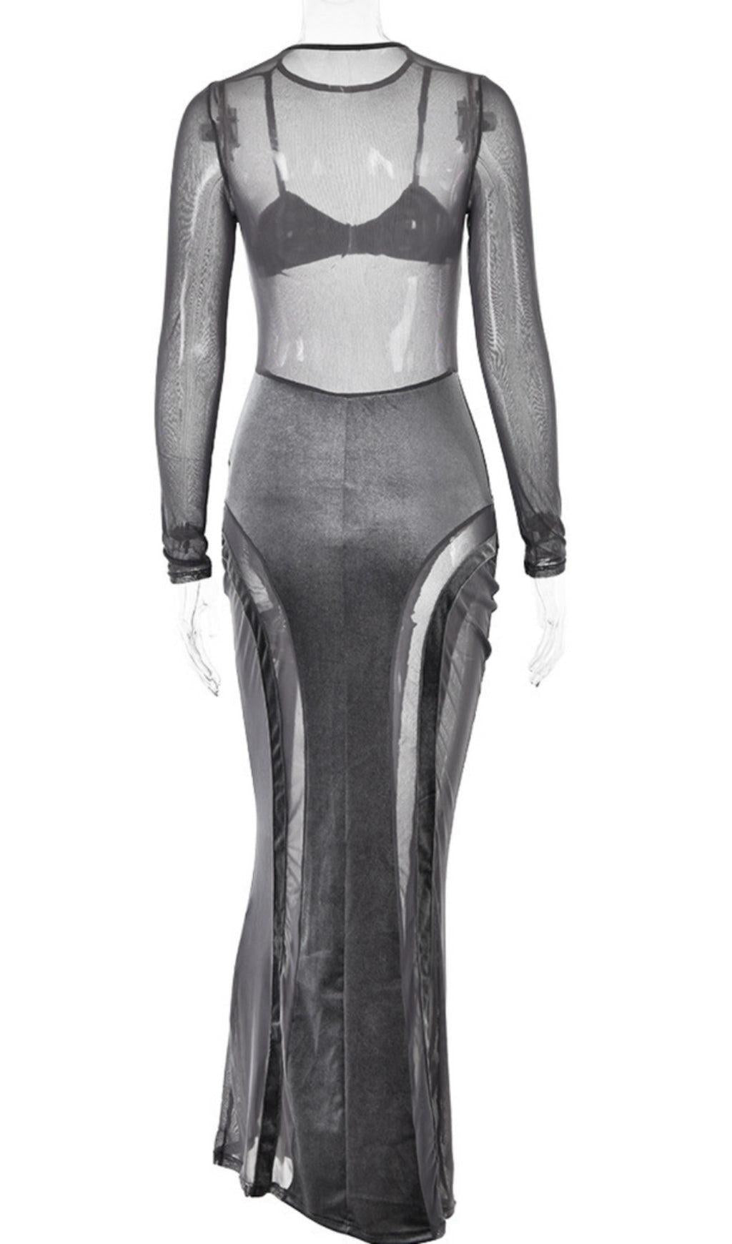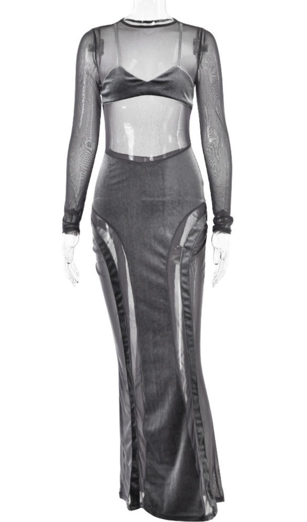 Show off your daring side! The perfect combination of stretch mesh and velvet material creates an eye-catching design with sheer panels to flatter your curves. With an exposed velvet micro bra and all-mesh back. it's easy and comfortable to wear for any special occasion. You're sure to make a statement with this beautiful maxi dress.
